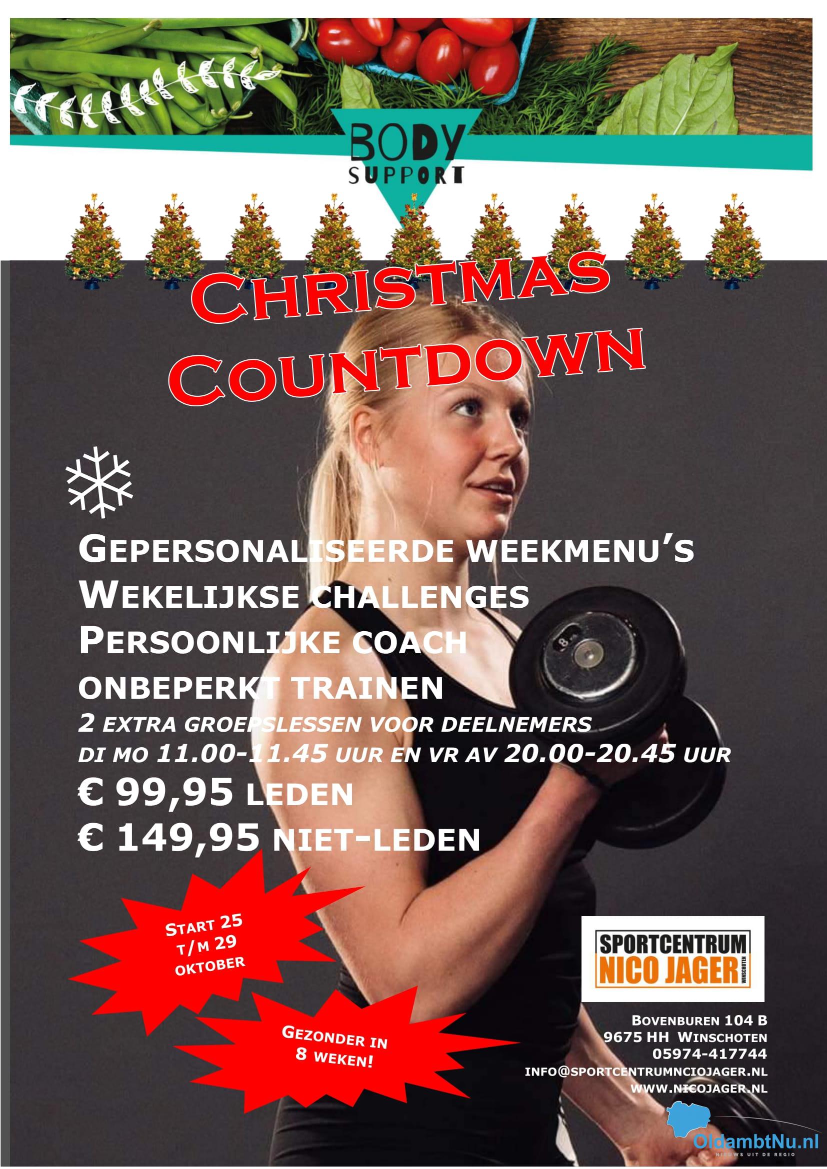 Aanmelden voor de Christmas Countdown kan van maandag 25 tot en met 29 oktober Kosten zijn € 99,95 voor leden en € 149,95 voor niet-leden. Aanmelden kan door naar het sportcentrum te bellen 0597-417744 of het aanmeldformulier in te vullen op www.nicojager.nl.