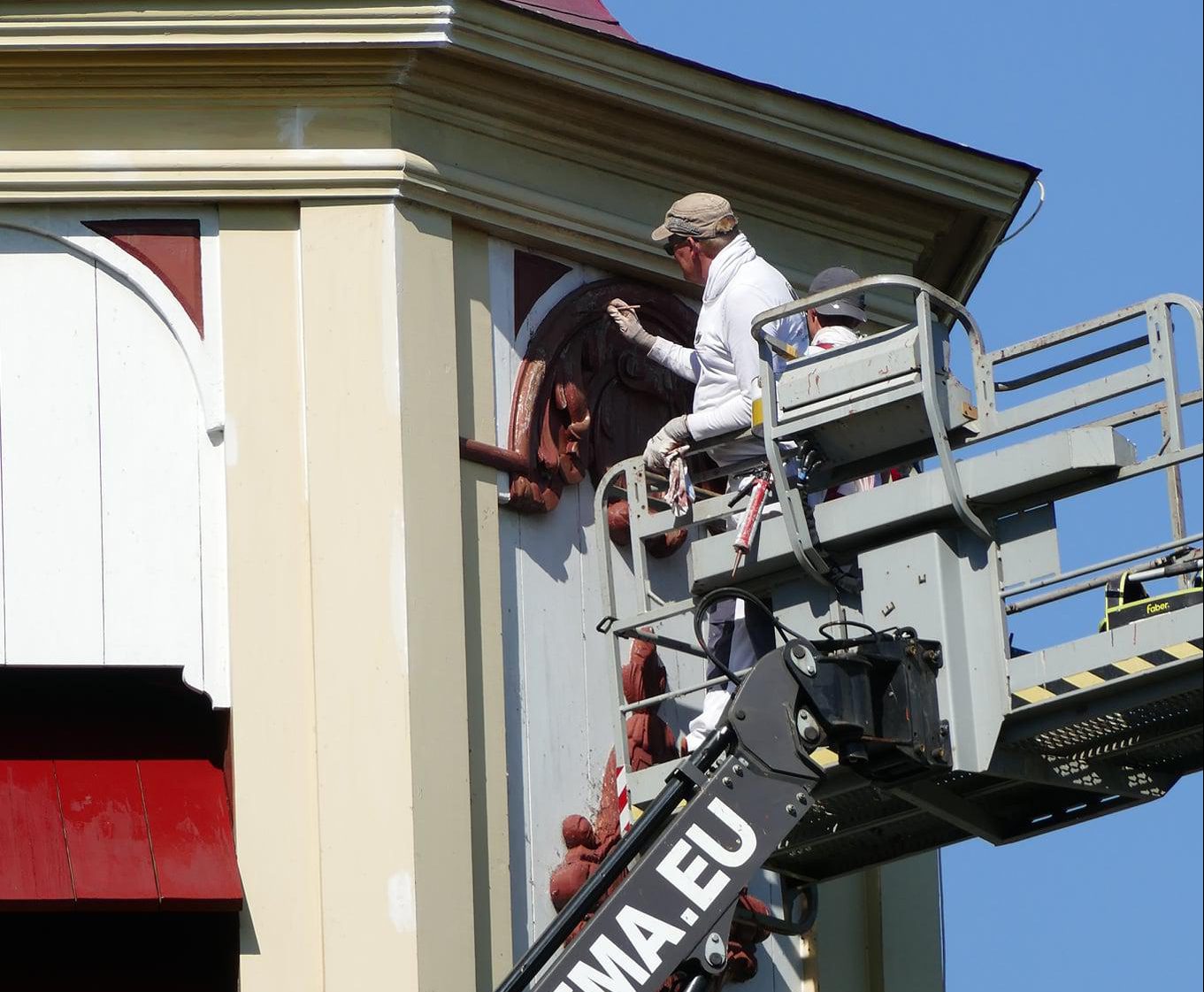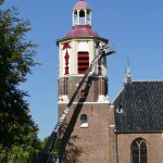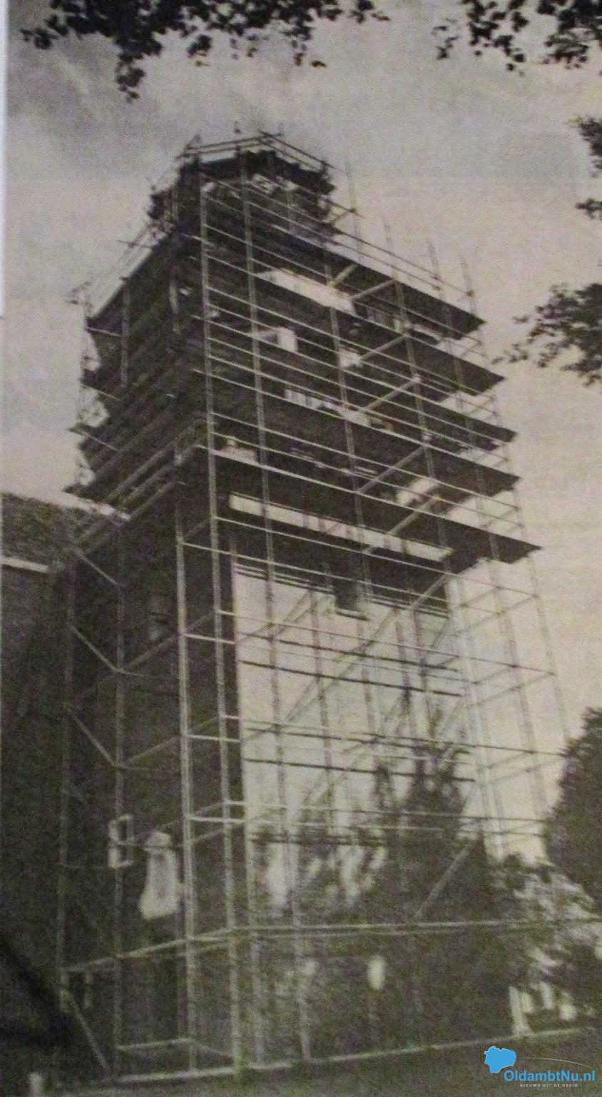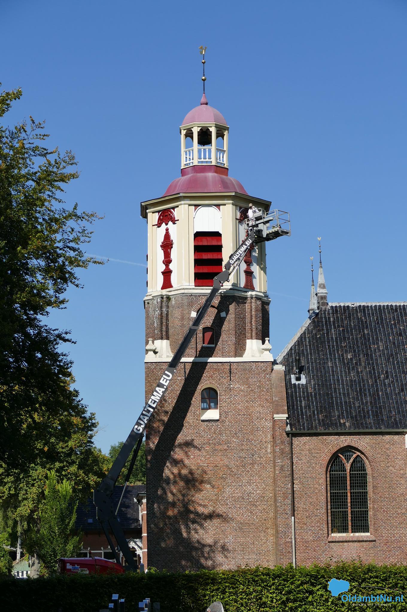 Midwolda – De afgelopen maand is de kerktoren in Midwolda weer geschilderd. Dit gebeurde met een hoogwerker. Heel anders dan toen de toren in 1980 geverfd werd. Toen werd er eerst een steiger op gebouwd en moesten de schilders met ladders van steiger naar steiger klimmen om zo de toren te schilderen.