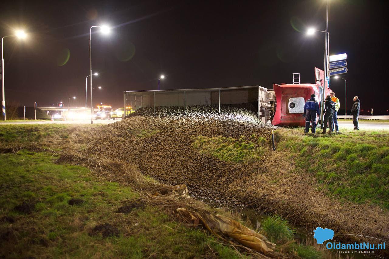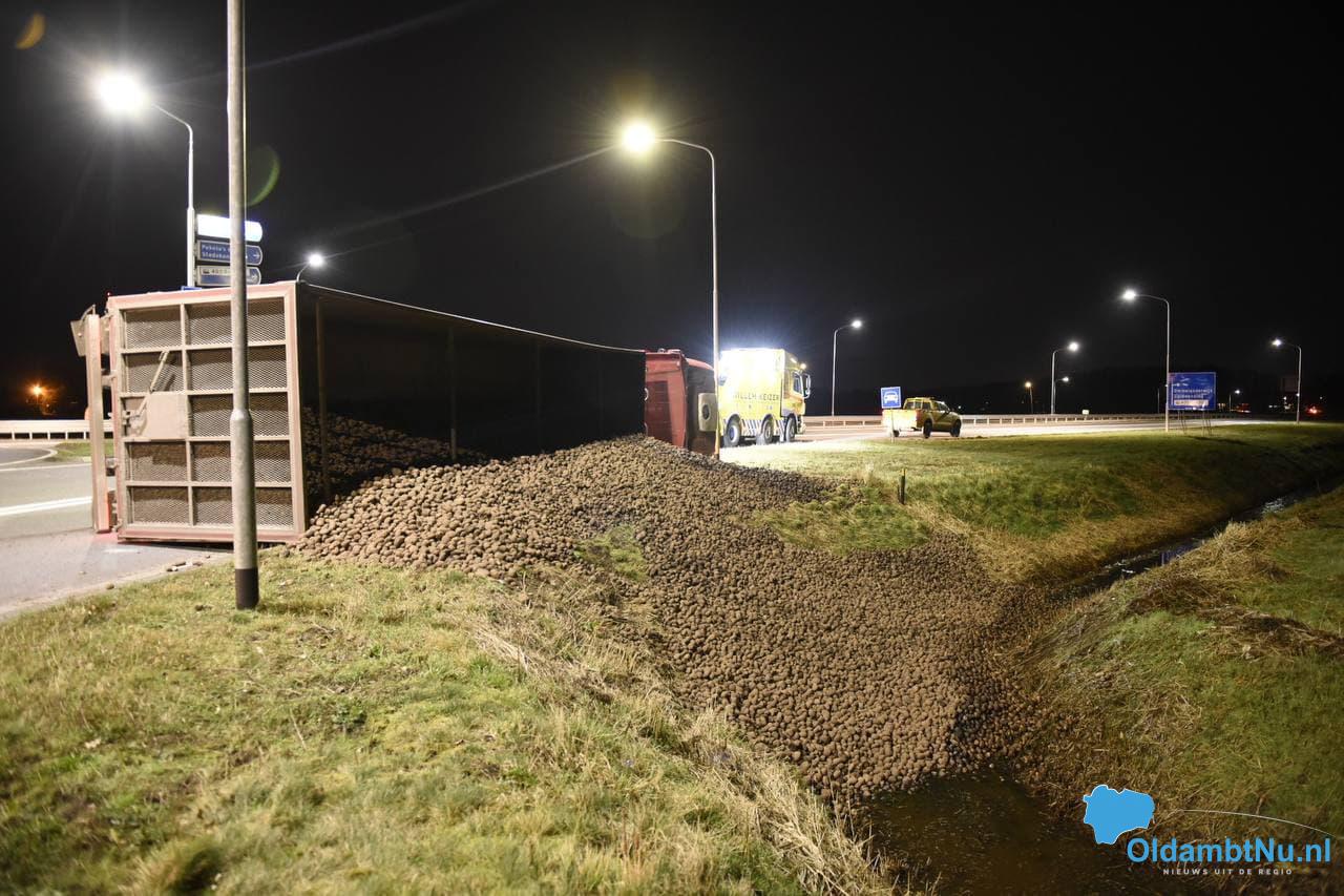 Veendam – Een vrachtwagen geladen met aardappels is donderdagavond gekanteld bij de rotonde van de N366 bij Veendam.