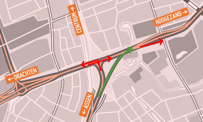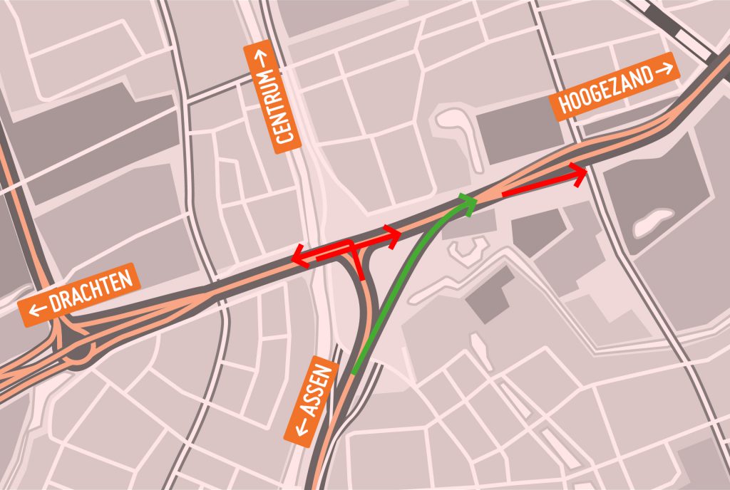 Verkeer vanuit Drachten richting Hoogezand wordt omgeleid via de westelijke, noordelijke en oostelijke ringweg van Groningen. Dat is op de omleidingsborden routenummer 7. Het verkeer vanuit Assen richting Drachten rijdt om via de N386 en N372 (via Vries en Peize) of via de overige ringwegen van Groningen (routenummer 8).