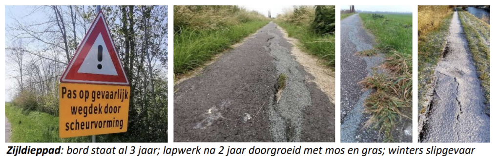 Het gebrek aan urgentie is ook zichtbaar in het dagelijks beheer en onderhoud van fietspaden. Oldambt doet al jaren niets aan haar fietspaden, met name op het platteland. Het maaibeheer van bermen gebeurt met (te) grote machines; paden worden daarmee door eigen aannemers aan gort gereden; randen van wegen en paden zijn (te) vaak beschadigd; paaltjes op fietspaden zijn vaak onnodig, niet verlicht en niet gemarkeerd; opzichters zien schades niet omdat ze niet op de fiets controleren en gele gevarenborden blijven in de gemeente Oldambt veel te lang staan (bijlage 2).
