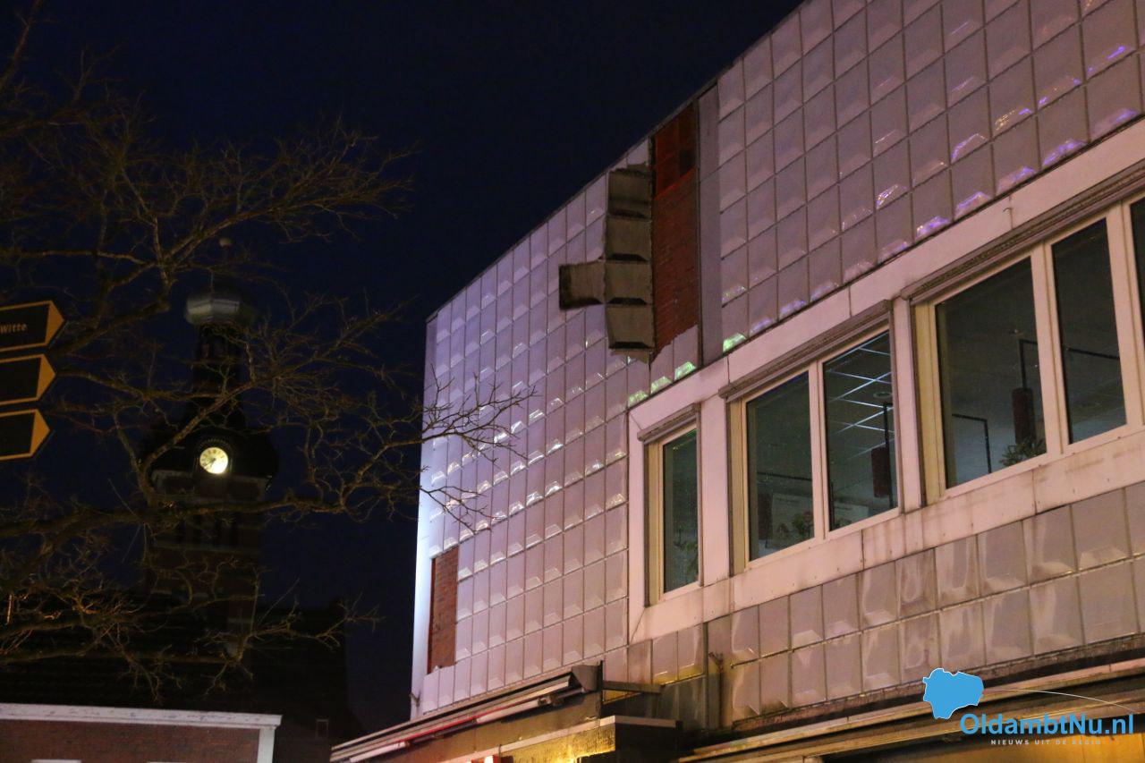 Een deel van de gevelbekleding van de Hema in Winschoten is afgebroken door de harde wind. De politie en brandweer kwamen ter plekke om de situatie, zo goed als kan, veilig te stellen.