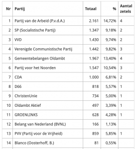Er zijn tijdens de verkiezingen 14.677 stemmen uitgebracht. Naast de ‘gewone’ stemmen waren er ook nog 54 blanco, 36 ongeldig en 1578 volmacht stemmen. Anders gezegd: 46% van de Oldambtsters heeft gestemd. Ten opzichte van de verkiezingen in 2018 (met een opkomst van 50,2%) is dat een daling van 4,2%. Onze burgemeester, Cora-Yfke Sikkema, vindt dat weinig en dus heel erg jammer.