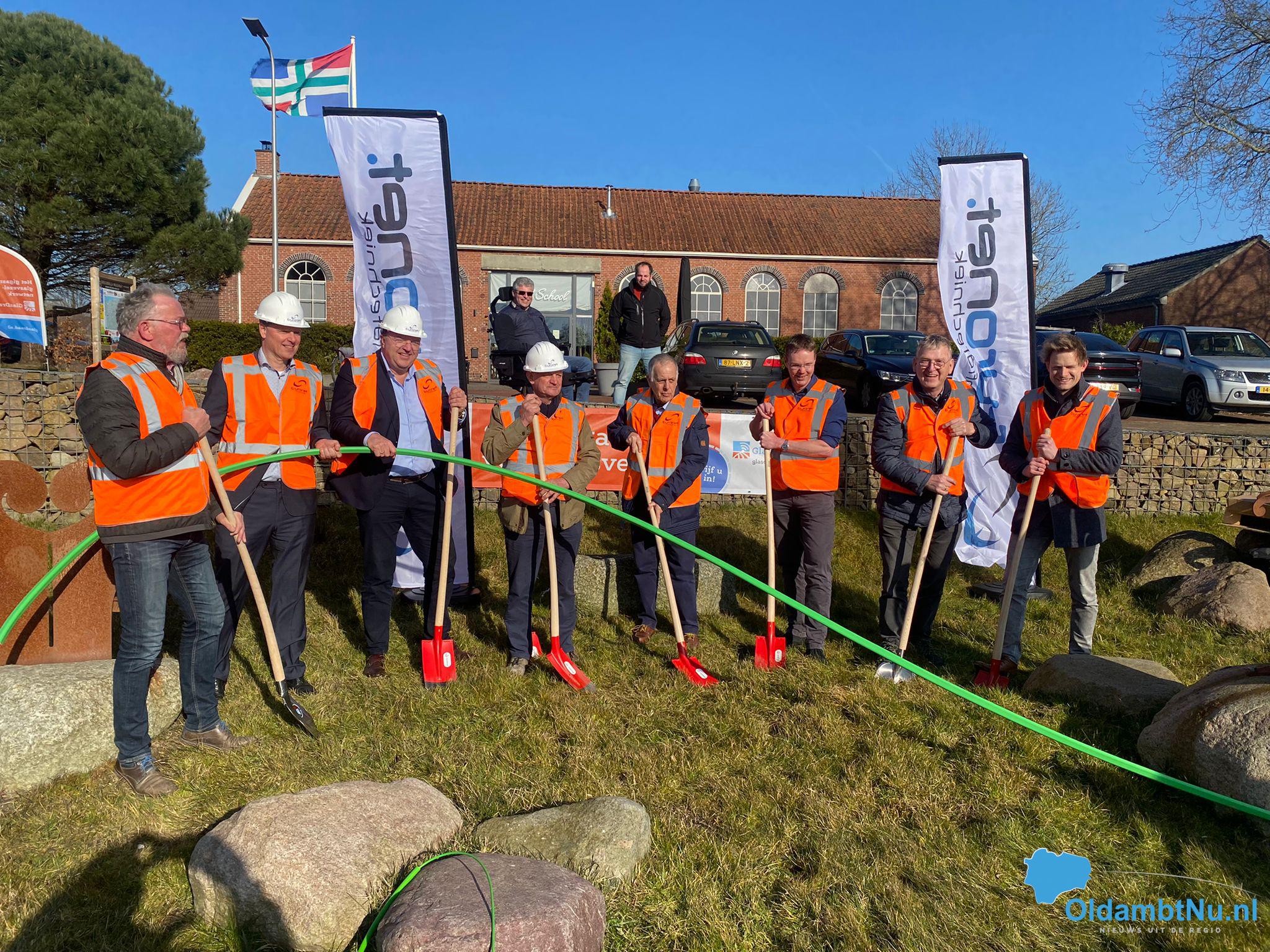 Buiten werd een eerste stuk kabel en buis met de schep in de hand neergelegd in het Oldambtse als start van het project. Met iedereen werd geproost op de start van de aanleg van het glasvezelnetwerk.