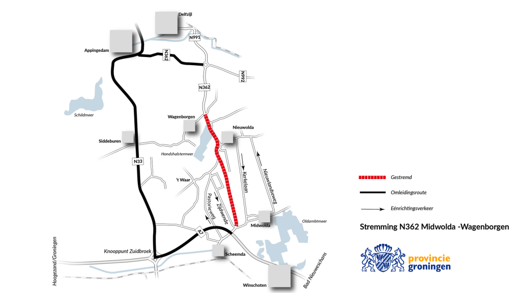 Scheemda – De provinciale weg N362 gaat vanaf maandag 30 mei twee maanden dicht voor groot onderhoud. De N362 is afgesloten vanaf de aansluiting met de A7 bij Scheemda tot de aansluiting met de Warvenweg en de Holeweg bij Weiwerd. Doorgaand verkeer tussen Scheemda en Delfzijl kan omrijden via de A7, N33 en een gedeelte van de N362. De werkzaamheden duren tot en met vrijdag 29 juli.