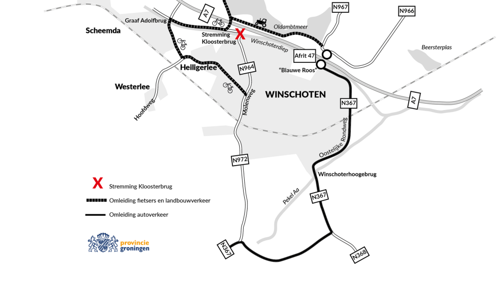 Doorgaand verkeer wordt zoveel mogelijk omgeleid via de A7, de Oostelijke Rondweg (N367) en verkeersknooppunt de ‘Blauwe Roos’ in Winschoten. Landbouwverkeer op de Hora Siccamaweg kan omrijden via Noordereinde en de ‘Blauwe Roos’. Fietsers op de Hora Siccamaweg worden omgeleid via de Graaf Adolfbrug en de Grintweg.