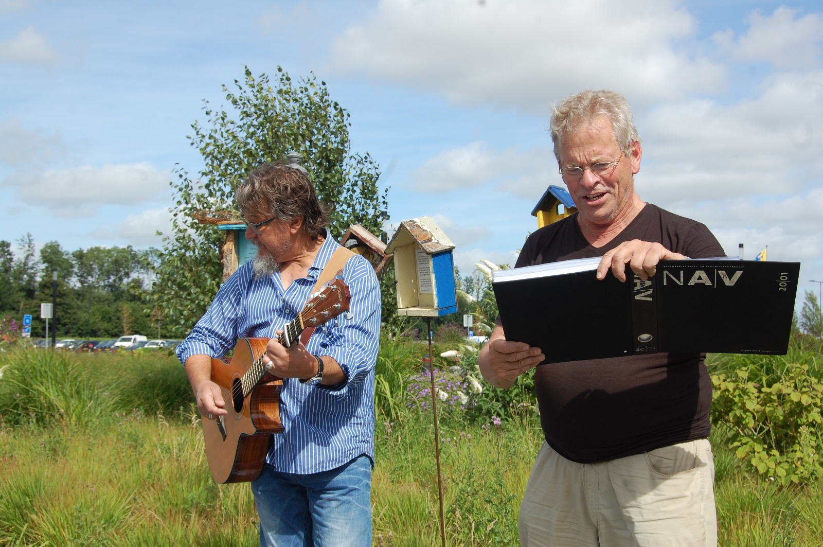 Scheemda – Initiatiefnemer van de gedichtenhuisjes dichter Sjoerd Visser heeft met een collega een gedicht-lied gezongen bij de plaatsing van de ruim 60 huisjes langs het voetpad bij het Ommelander Ziekenhuis te Scheemda. Samen met Hennie Sanders, lid raad van het bestuur van het OZG, Erik Gersonius, manager ondersteunende diensten en Christine Meijer bestuurslid vrienden van het OZG en nog andere dichters zijn de huisjes in allerlei vormen bij het ziekenhuis geplaatst.