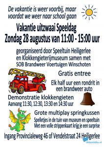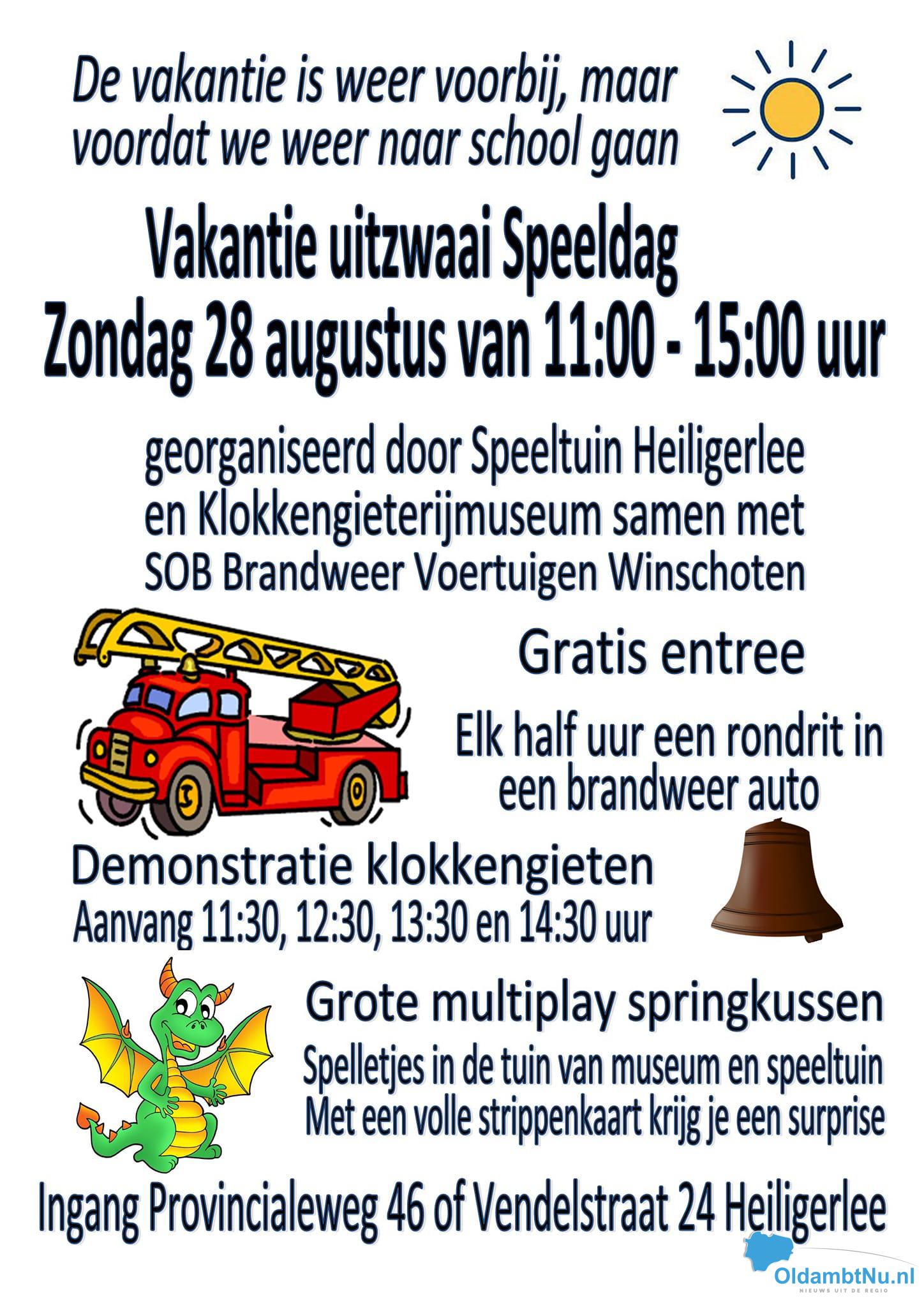 De Vakantie Uitzwaai Speeldag is van 11.00 tot 15.00 uur, georganiseerd door de Speeltuin Heiligerlee en Klokkengieterijmuseum in samenwerking SOB Brandweer Voertuigen Winschoten.
