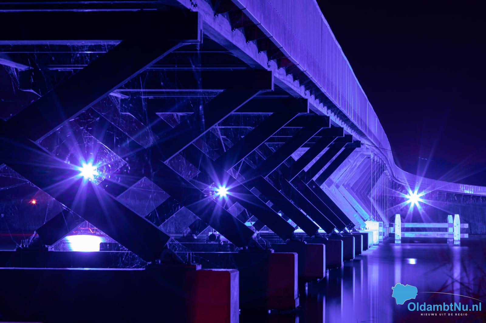 Oldambt – De Pieter Smitbrug wordt tijdens de ‘finale’ van straattheaterfestival Waterbei feeëriek verlicht. Fietsers en voetgangers worden zaterdagavond 27 augustus op geïllumineerde wijze naar de Wilgenborg in Blauwestad geleid om de knetterende slotact van het spetterende tweedaagse evenement mee te maken.