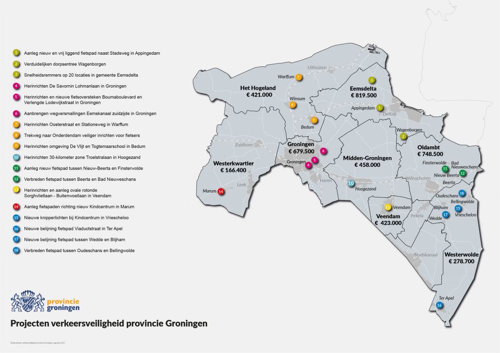De 18 projecten worden verspreid over de provincie uitgevoerd. Zo komen er een nieuwe fietspaden in Appingedam en tussen Beerta en Finsterwolde. In Warffum en Hoogezand worden 30-kilometerzones ingericht. In Bedum en Marum is aandacht voor de verkeersveiligheid rondom een school en kinderdagverblijf.