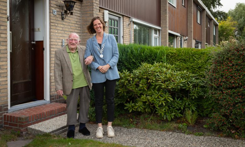 Winschoten – Buiten regent en waait het, binnen brandt de kachel behaaglijk. Dhr. Molenkamp neemt de felicitaties van burgemeester Cora-Yfke Sikkema in ontvangst. Zaterdag werd hij 101 jaar. Wat zijn geheim is? Daar is hij heel duidelijk over “gewoon leven. Het leven is net een loterij, de een heeft geluk, de ander niet”.