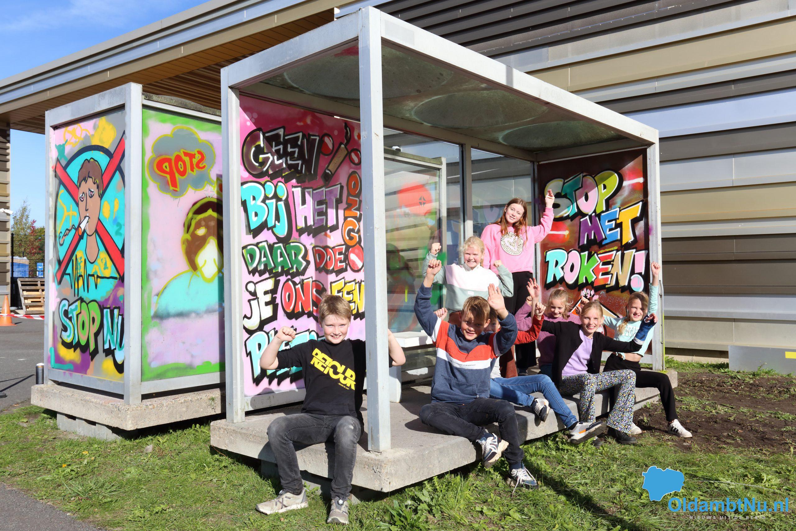 Er mocht op het terrein nog worden gerookt in twee speciale rookhaltes, maar deze zijn vanaf nu buiten gebruik. Vandaag is met een symbolische samenkomst een nieuwe stap gezet om de gezondheid van de doelgroep te verbeteren. Onder het toeziend oog van medewerkers gingen groep 7 en 8 van basisschool de Annewieke uit Scheemda met graffiti aan de slag om de rookhaltes vrolijk te versieren. Voor de panelen wordt een mooie bestemming gezocht. De rookhaltes worden vervolgens weggehaald en afgevoerd.
