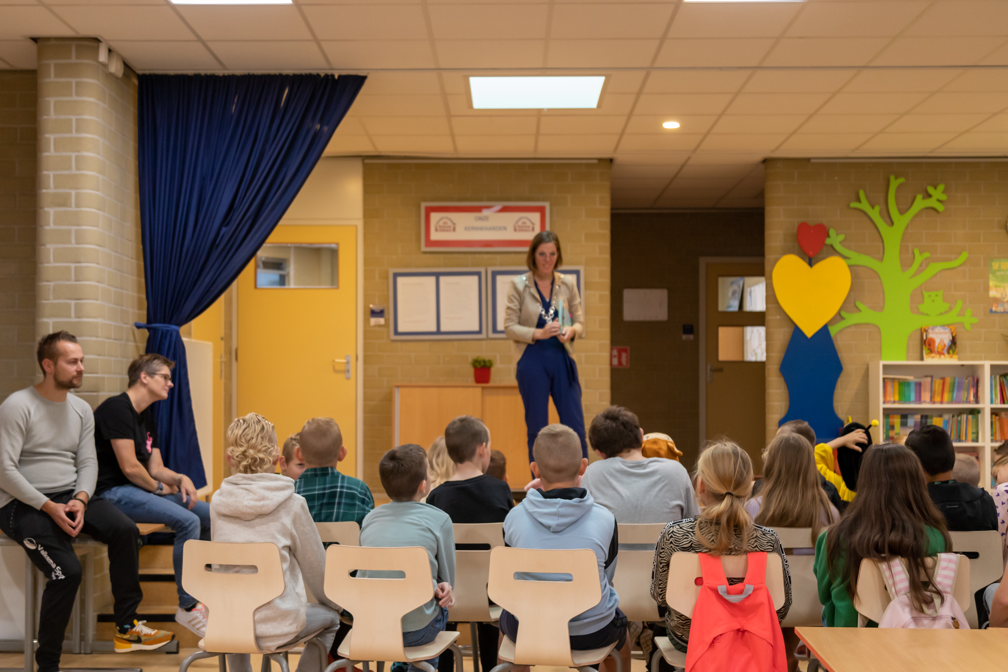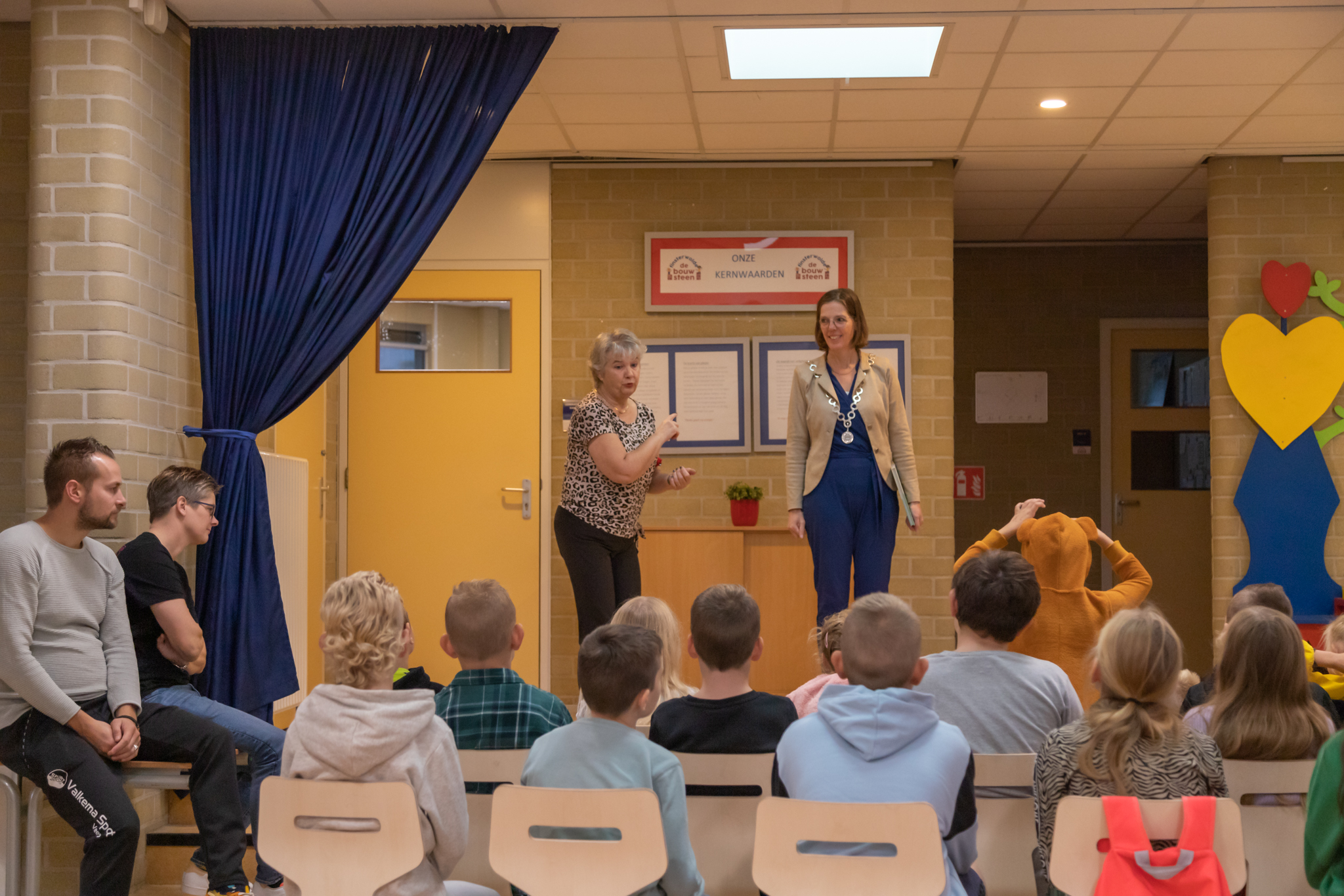 Nadat de ouders weer naar huis gingen was eerst de onderbouw aan de beurt om met burgemeester Cora-Yfke Sikkema naar de klas te gaan waar ze werden voorgelezen. Het was een spannend verhaal, er werd super goed geluisterd. Daarna mochten de kinderen vragen stellen aan Cora-Yfke wat leuke interactie gaf.