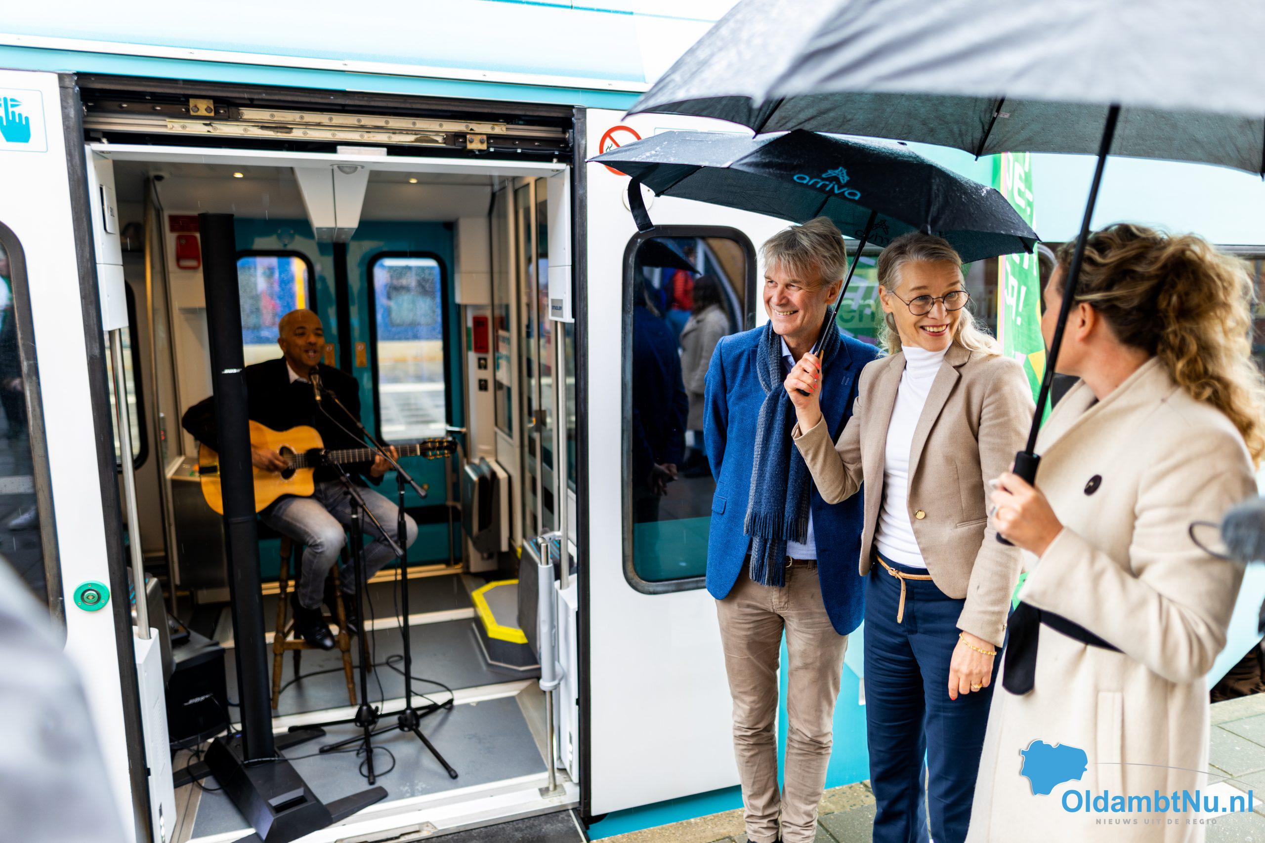 Tijdens de onthulling op 13 oktober bracht de Groningse muzikant Arnold Veeman een muzikale ode aan D’ Olle Grieze en haar prachtige, hippe kerkklokkenspel. Yvonne Dubben (Ontwikkelmanager Arriva), Elsa Weelink (Adjunct directeur Marketing Groningen) en Wilko Huyink (directeur Groningen Bereikbaar) namen als eerste een kijkje in de nieuwe WINK-trein.