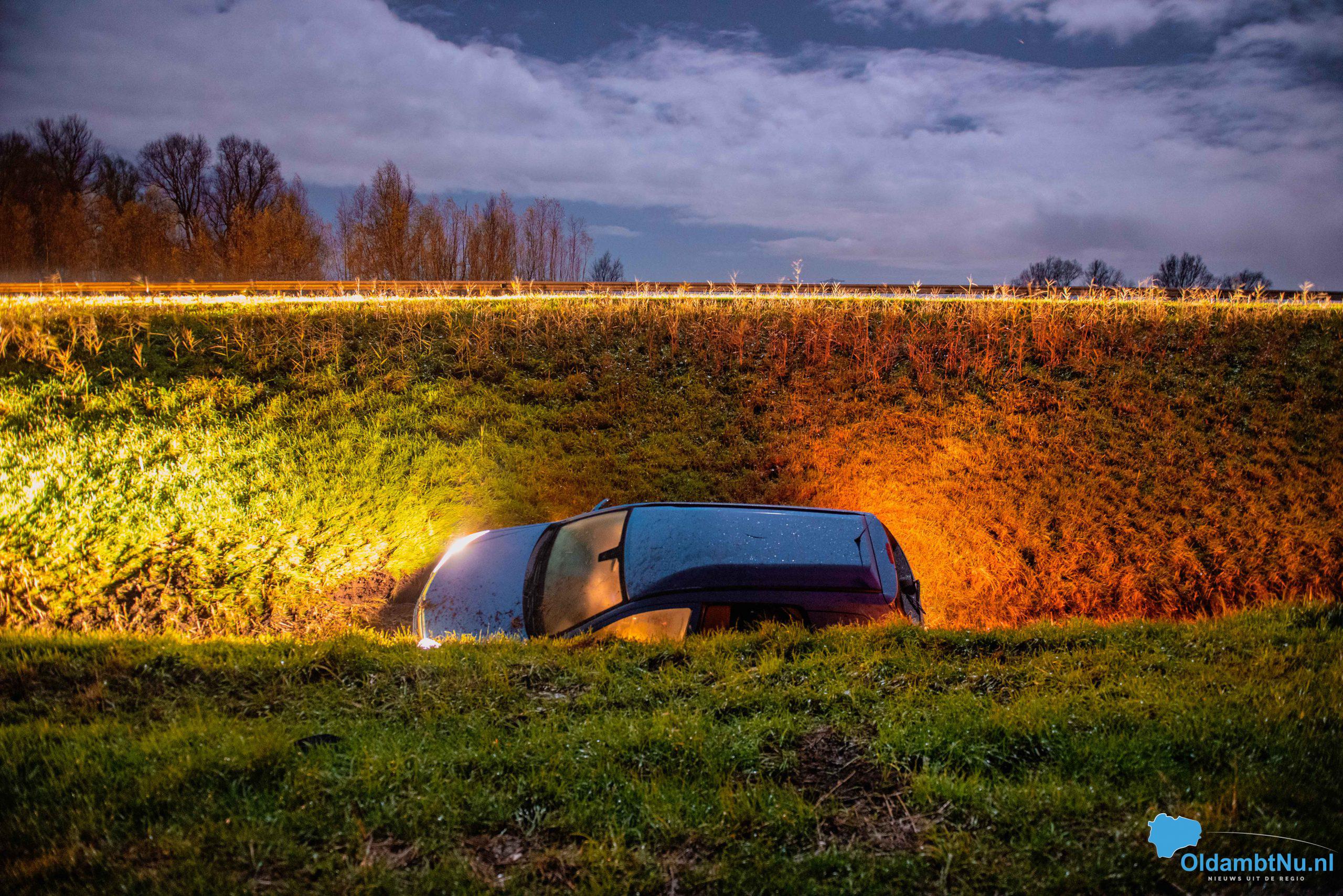 Rijkswaterstaat heeft tijdelijk één rijstrook afgesloten om zo een veilige werkomgeving te creëren voor de berger. Berger Fruitema uit Oude Pekela heeft de auto uit de sloot gehaald en geborgen.