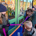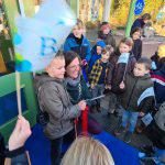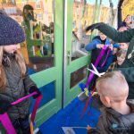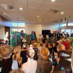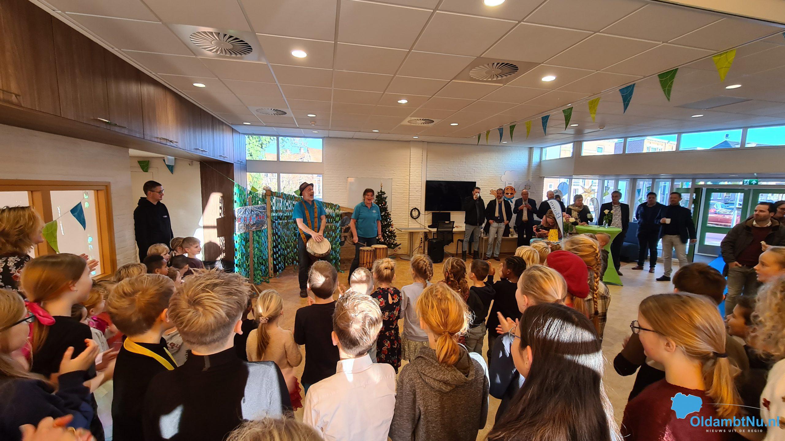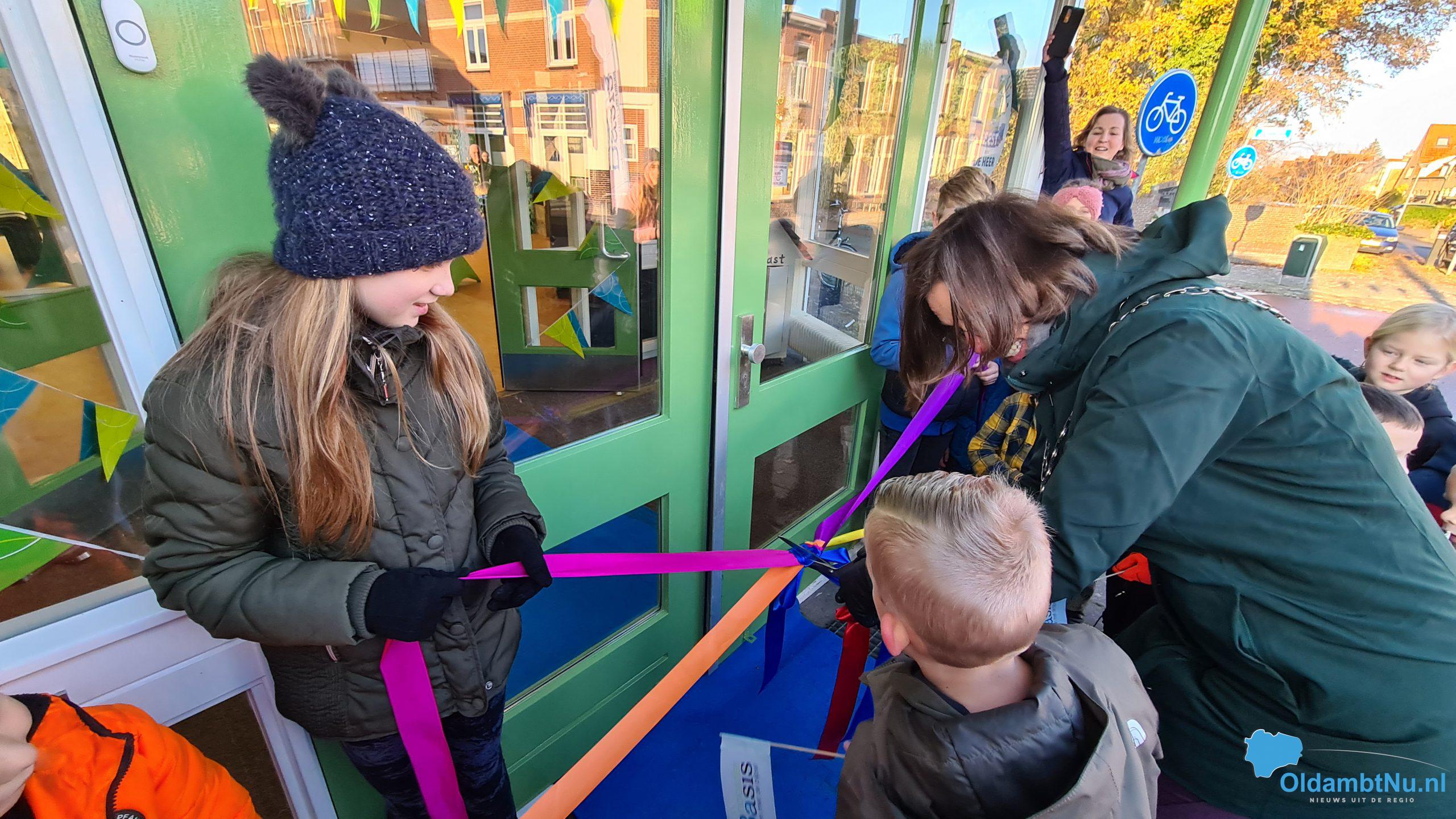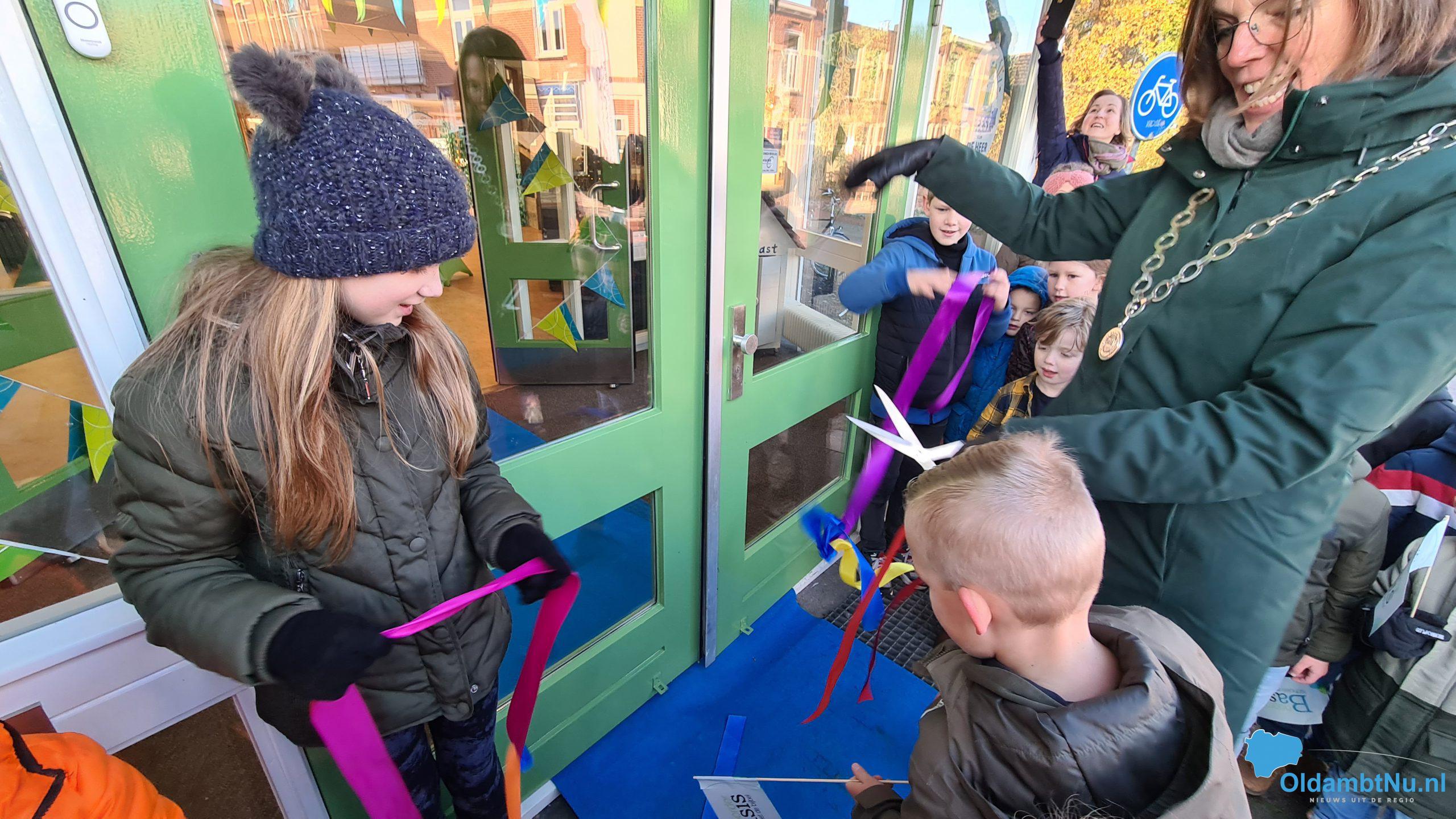 Nadat de kinderen hun schoollied uit volle borst hadden gezongen heeft Cora-Yfke Sikkema, samen met kinderen het lint doorgeknipt. Eenmaal binnen stond er voor de kinderen een muzikale verrassing te wachten.