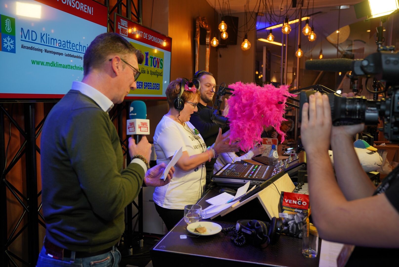 17.00 uur: Vanuit een vol theatercafé is Het Tafelhuis donderdagmiddag om 17:00 uur geopend. Patrick van Campenhout heeft burgemeester Cora-Yfke Sikkema en wethouder Erich Wünker uitgenodigd om iets te vertellen naar aanleiding van deze vijfde editie. Het was voor mevrouw Sikkema de eerste keer dat ze live dit kon meemaken. “Ik vind het bijzonder dat de Voedselbank is gekozen als goed doel voor deze marathon uitzending.”