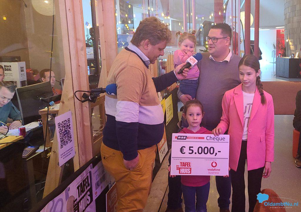14.35 uur: Toen stond daar ineens Joost, directeur van RSE telecom bij de brievenbus met een enorme cheque in zijn handen die hij samen onthulde met zijn dochters en nichtje. Op de cheque stond een bedrag van maar liefst € 5.000 euro! TE GEK!