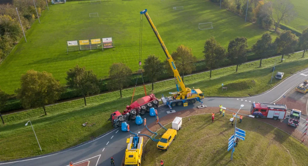 Een vrachtwagen geladen met cement is dinsdag 8 november aan het eind van de ochtend gekanteld. Dit gebeurde bij een eenzijdig ongeval op een rotonde van de Oude Rijksweg (N362) in Scheemda.