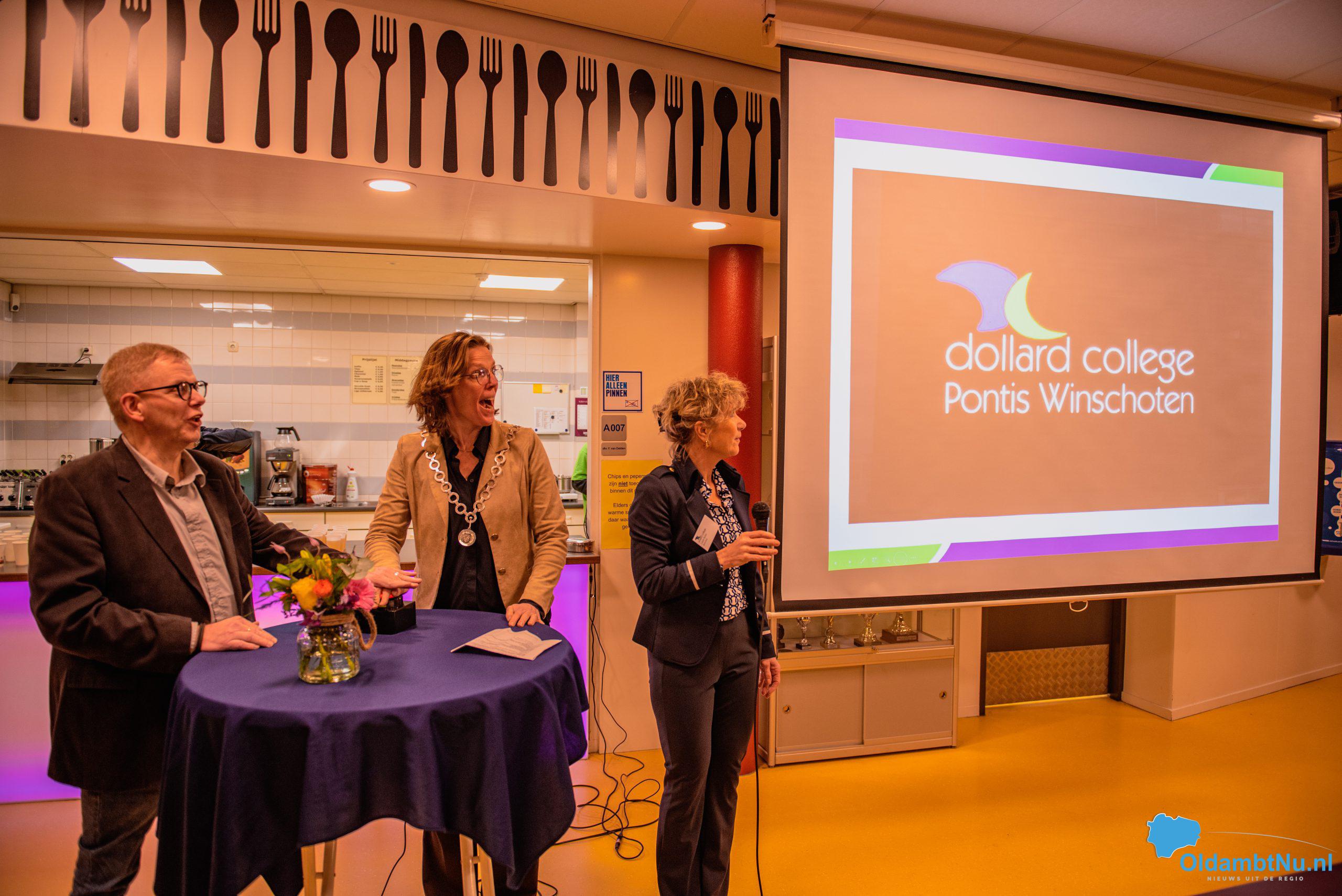 Winschoten – Met een druk op de knop hebben burgemeester Cora-Yfke Sikkema en wethouder Jurrie Nieboer de nieuwe naam onthuld van de vestigingen van het Dollard College aan het Hommesplein en Bovenburen in ‘Pontis’. Het wordt nu dus Dollard College Pontis Winschoten.