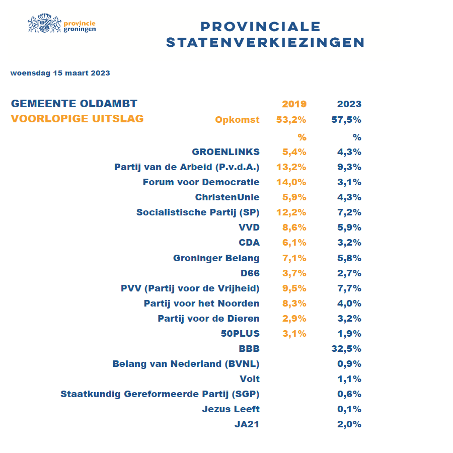 De BoerBurgerBeweging (BBB) is de winnaar geworden in de gemeente Oldambt. De nieuwe partij kreeg bijna een derde van de stemmen. Forum voor Democratie (FvD) daalde procentueel het hardst. De partij behaalde 3,1 procent van de stemmen. In 2019 was dat 14,0 procent.