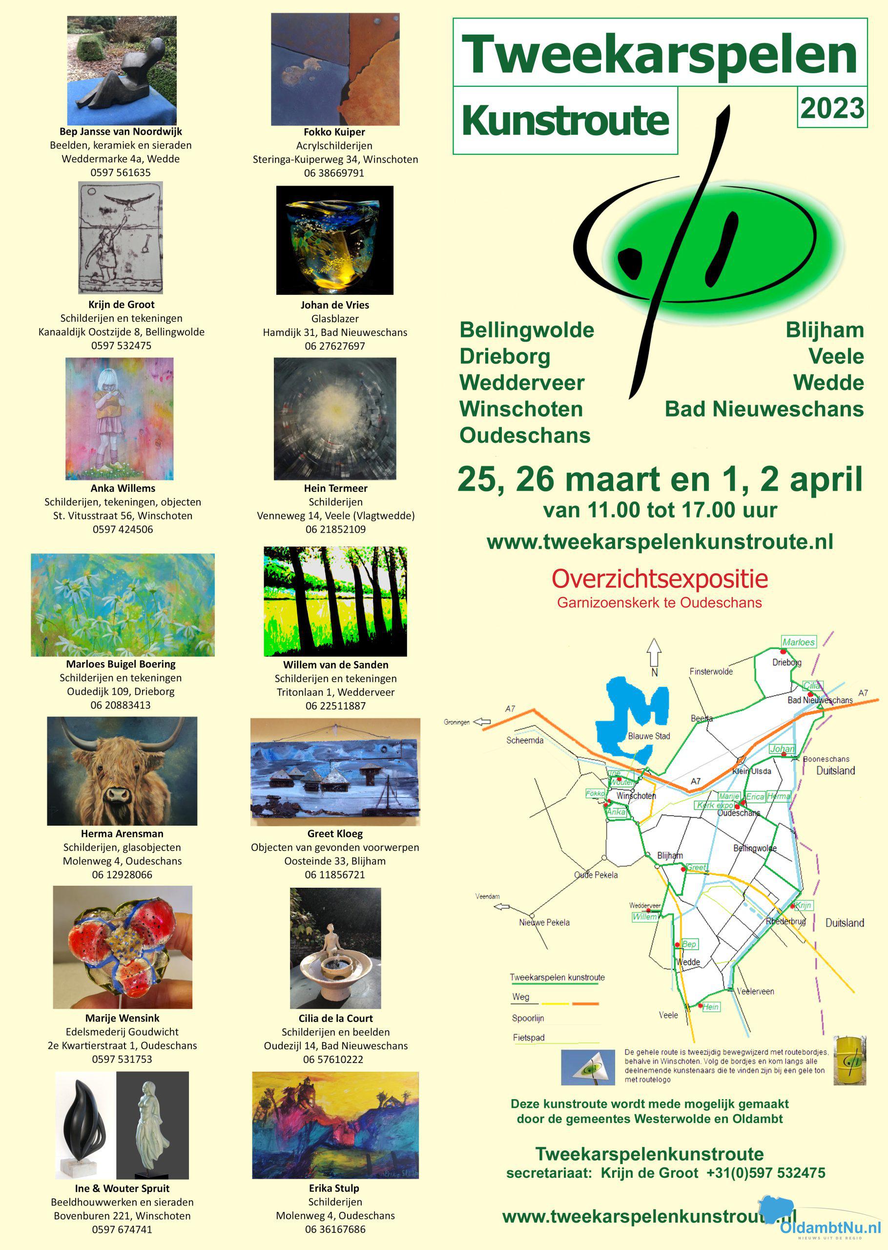 Er doen 15 kunstenaars mee verspreid over 13 locaties. Tevens is er weer een overzichtsexpositie in de Garnizoenskerk in Oudeschans. We verheugen ons weer op uw bezoek op 1 of 2 april tussen 11.00 en 17.00 uur.