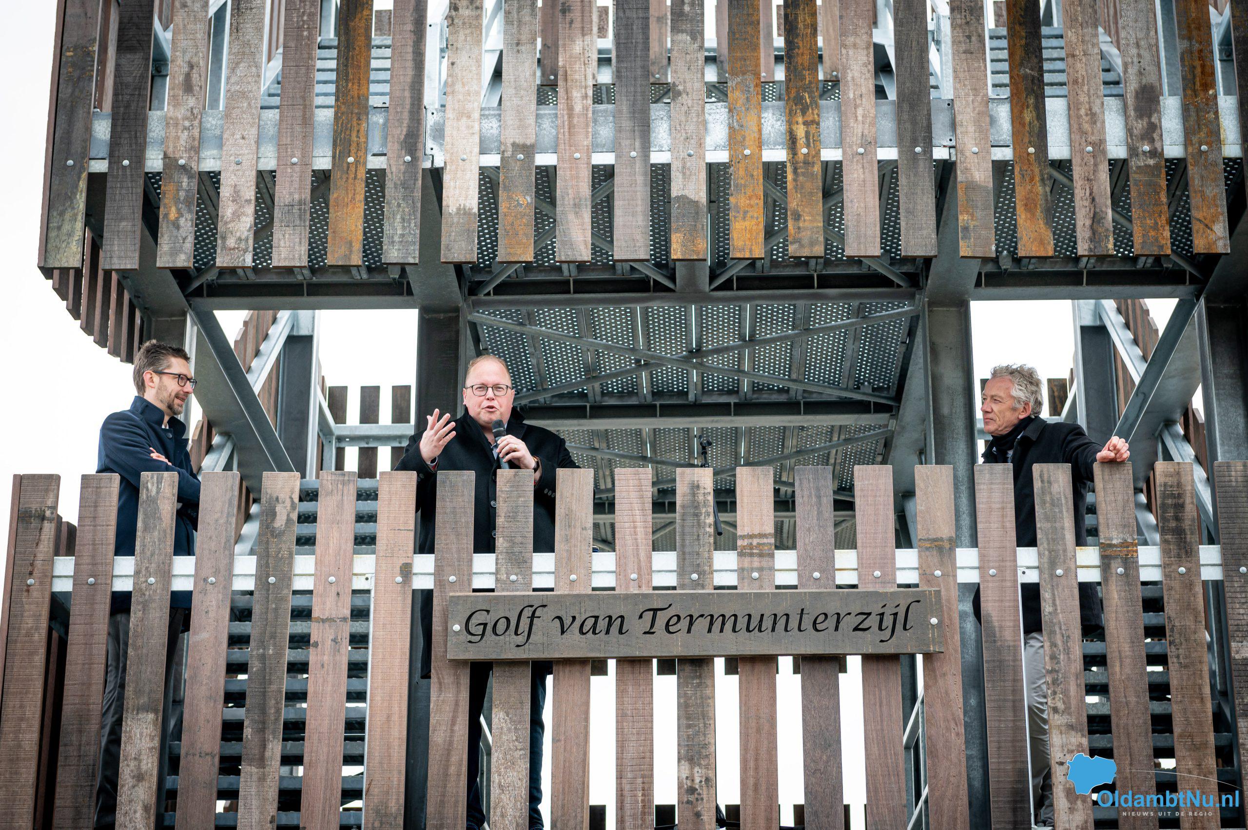 Termunterzijl – Op donderdag 30 maart is de herinrichting van Kleine Polder in Termunterzijl feestelijk afgerond in aanwezigheid van betrokken partijen. Gedeputeerde Johan Hamster van de provincie Groningen en burgemeester Ben Visser van de gemeente Eemsdelta hebben Kleine Polder officieel geopend door het luiden van de scheepsbel vanaf de nieuwe uitkijktoren ‘De Golf van Termunterzijl’.