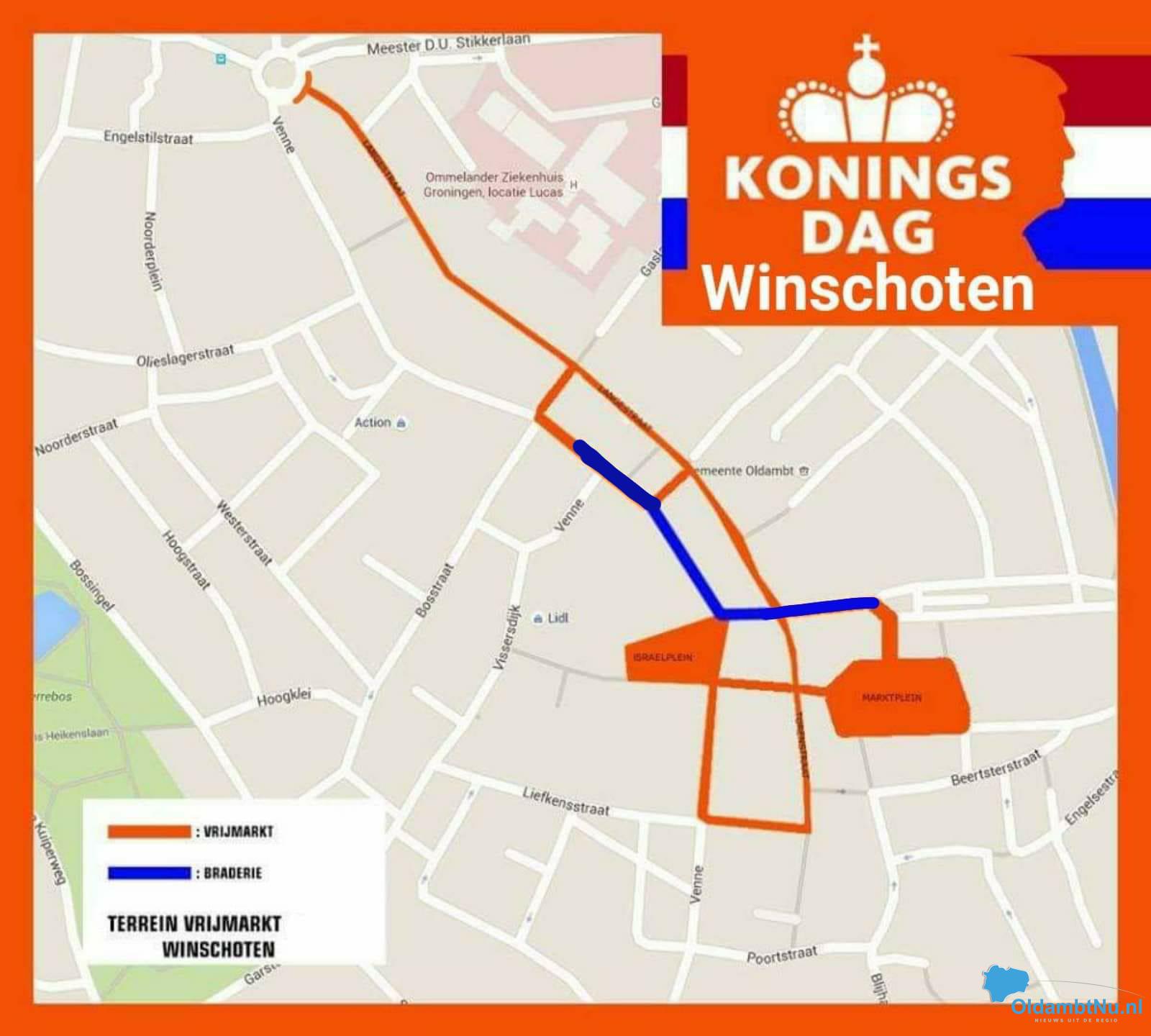 De locatie van de Winschoter Koningsmarkt vindt plaats in de binnenstad van Winschoten. Zie plattegrond (dezelfde opzet als andere jaren). Zoek jezelf een plekje uit om te staan! Hou hierbij wel rekening met de winkeliers en elkaar en volg eventuele aanwijzingen op van de organisatie.