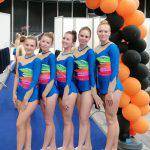 De Senioren mochten als allerlaatste hun prachtige oefeningen tonen aan het publiek. Met aanmoediging van de jongste gymnasten en de Groningse vlag maakten deze meiden de feestvreugde compleet. Het lukte Elise, Vesna, Marijn, Melissa en Mette om, met een grote voorsprong op de rest, zowel met knots als met hoepel de 1e plaats te bemachtigen!