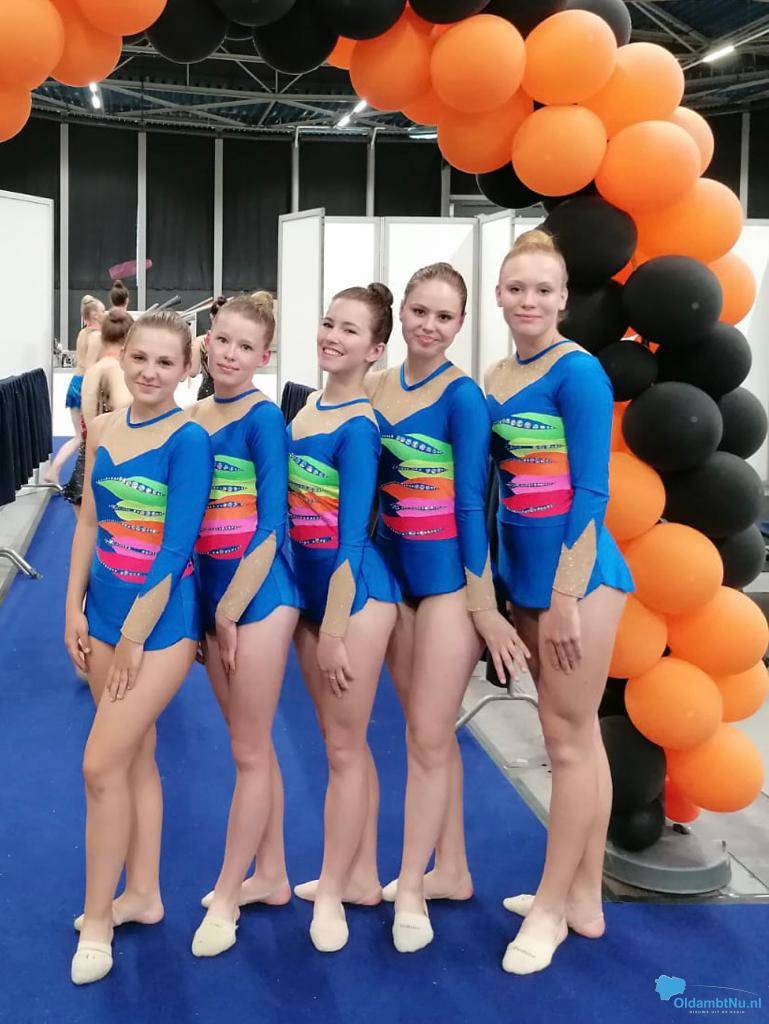 De Senioren mochten als allerlaatste hun prachtige oefeningen tonen aan het publiek. Met aanmoediging van de jongste gymnasten en de Groningse vlag maakten deze meiden de feestvreugde compleet. Het lukte Elise, Vesna, Marijn, Melissa en Mette om, met een grote voorsprong op de rest, zowel met knots als met hoepel de 1e plaats te bemachtigen!