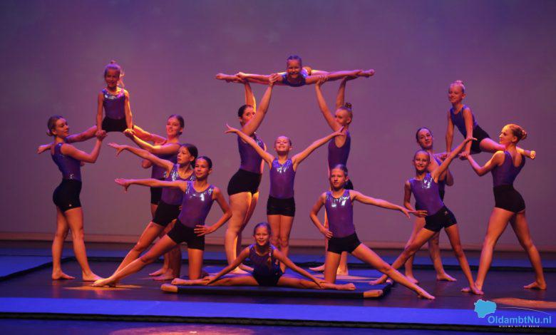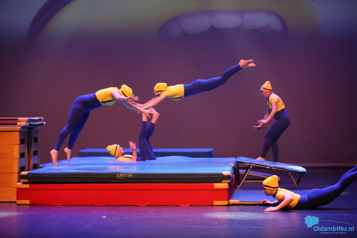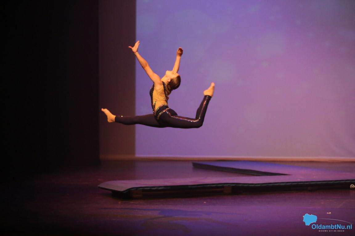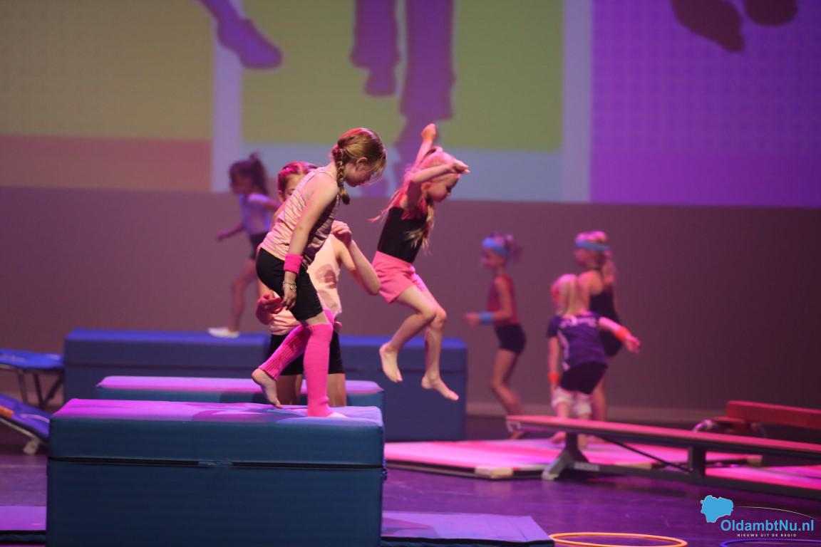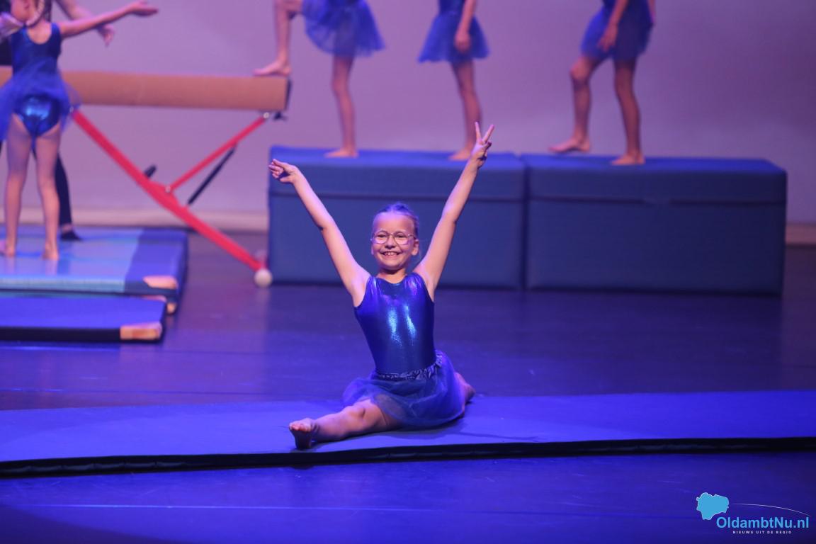 En een spetterende show werd het. Zo’n 200 leden in de leeftijd tussen de 3 en 83 jaar stonden te stralen op het toneel. De technische leiding heeft met veel enthousiasme een zeer feestelijke en professionele show in elkaar gezet. Vrolijke dansjes en oefeningen op gymtoestellen werden afgewisseld door mooie sierlijke ritmische oefeningen met veel linten en hoepels. Daarnaast kwamen de acrogymnasten en turnsters met veel