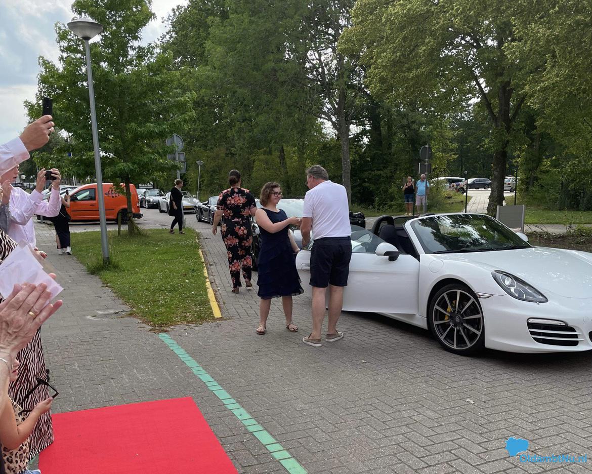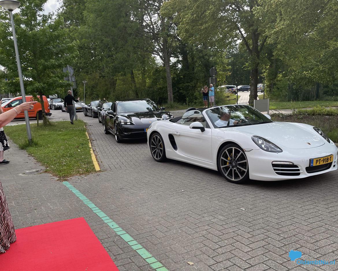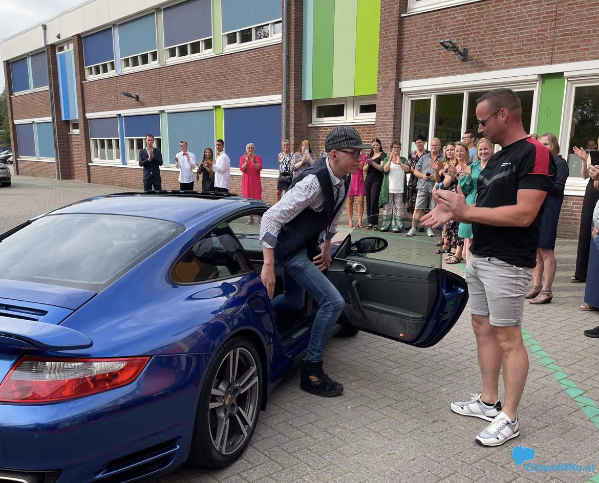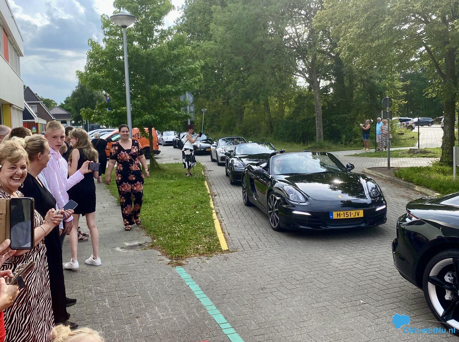 Winschoten – Afgelopen dinsdagavond stond de geslaagde leerlingen van de Meentschool in Winschoten wel een erg aangename verrassing te wachten. Ze werden namelijk in twaalf prachtige Porsches naar school gebracht om daar hun welverdiende diploma in ontvangst te nemen.