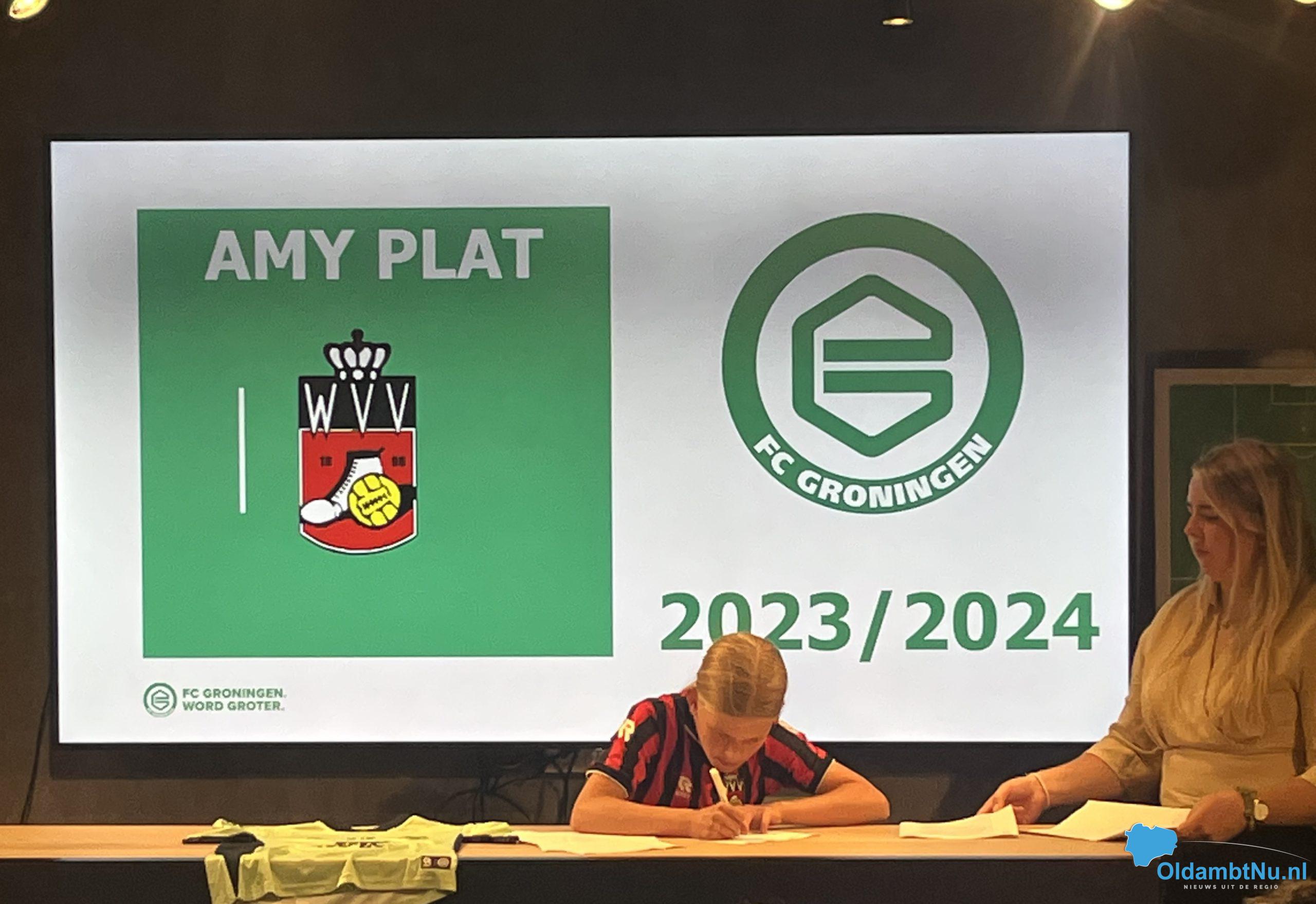 Winschoten/Groningen – De 11-jarige Amy Plat uit Winschoten heeft vorige week een contract getekend bij FC Groningen. Plat speelt sinds haar 9e bij WVV in de spits. Daar bleek al snel dat ze goed kon voetballen en met menig trucje de tegenstander te slim af was.