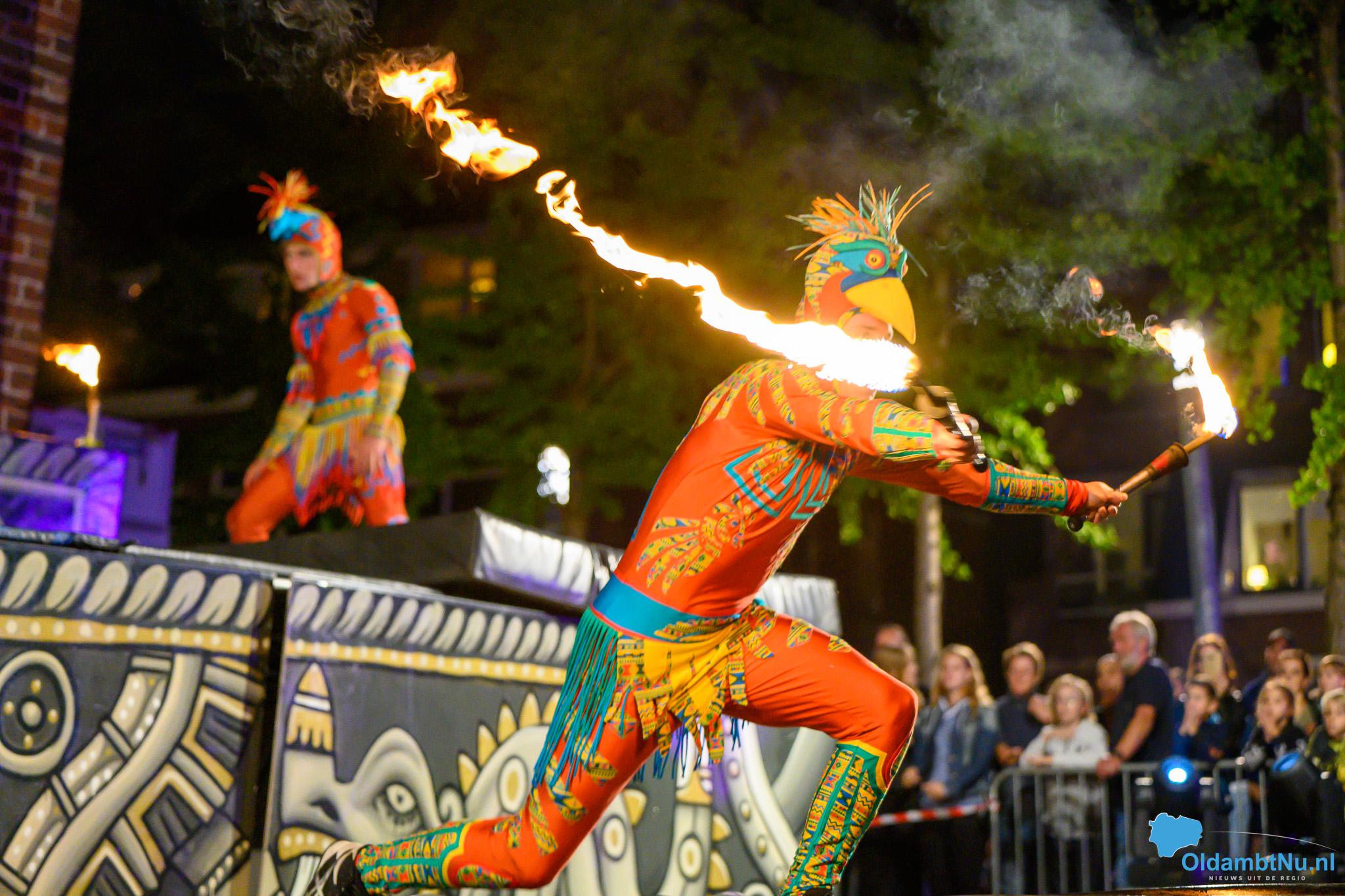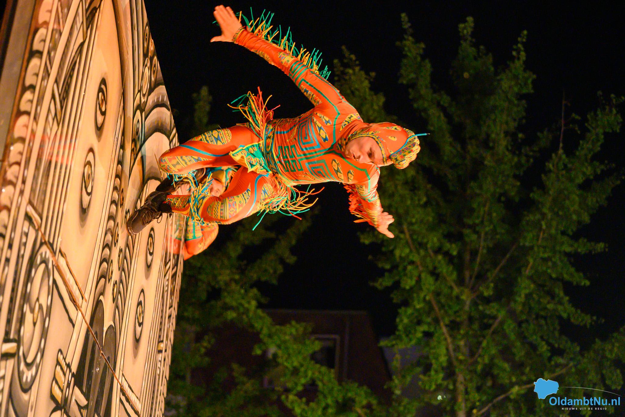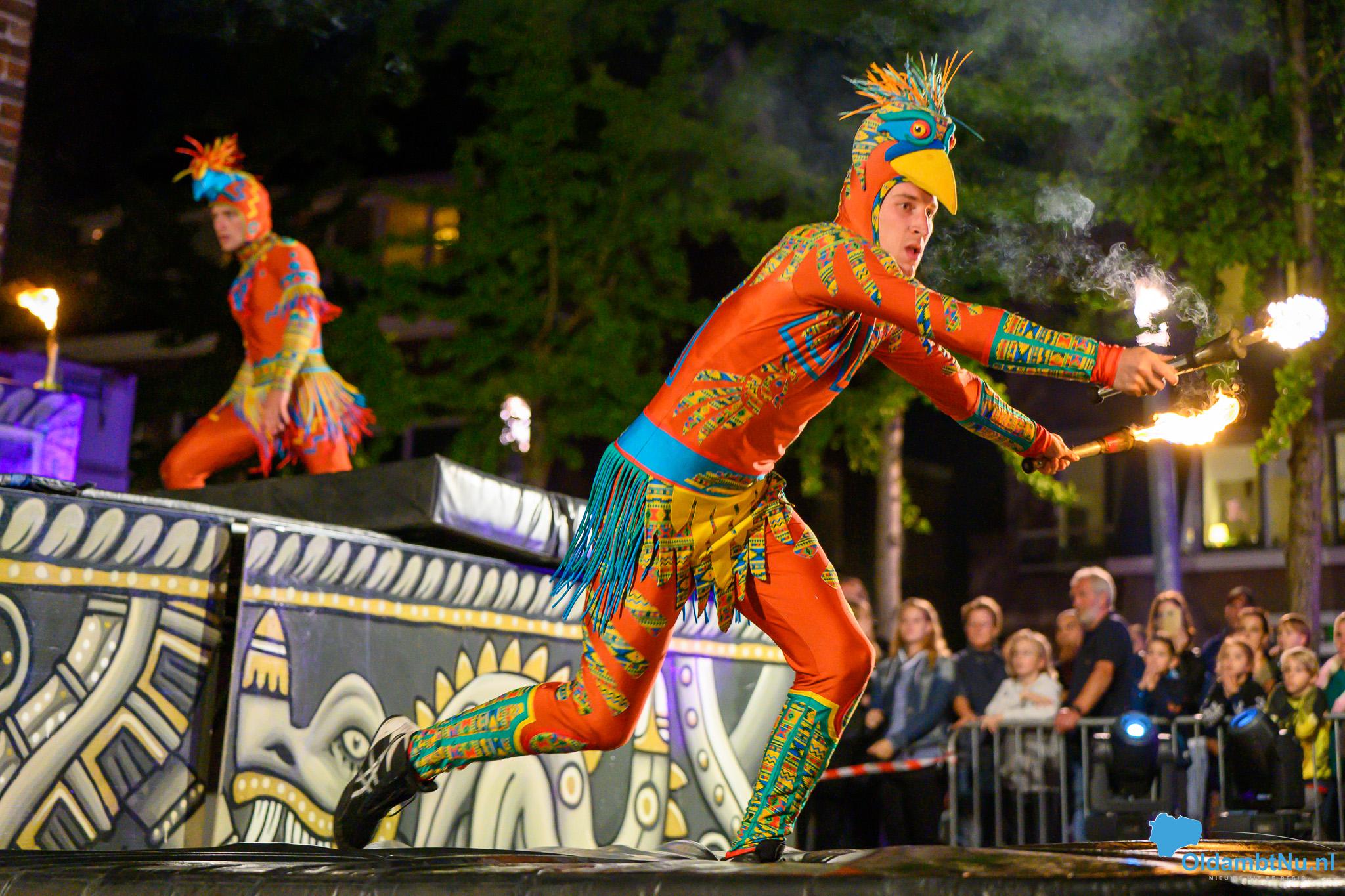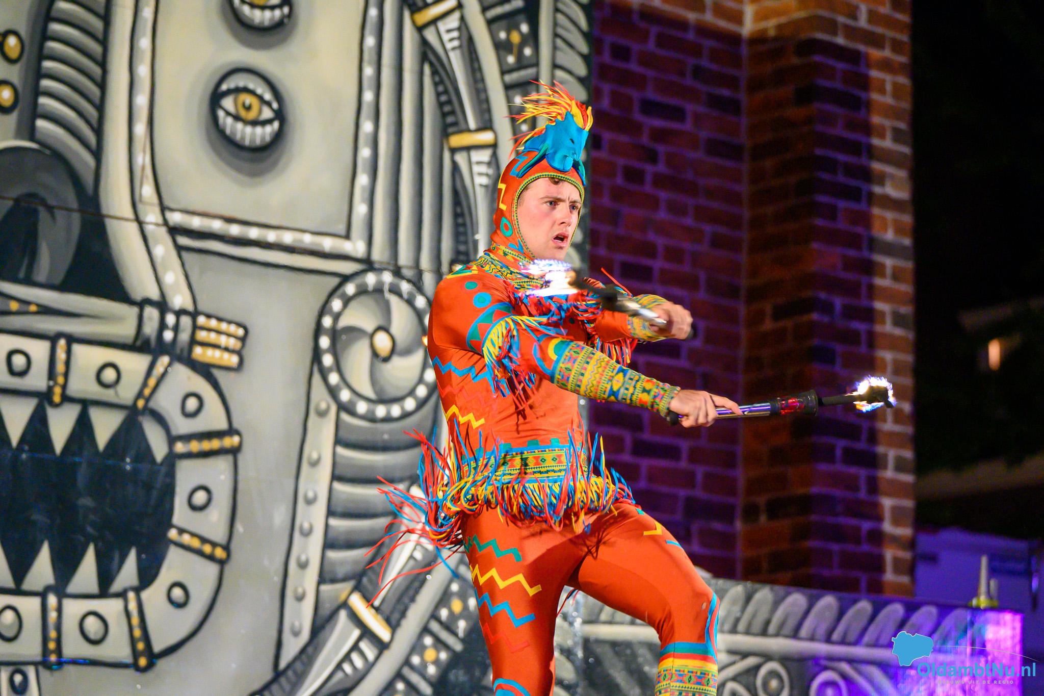 De slotact was op het Marktplein met een trampoline act van ‘Mayakrijgers’, die voor hun ‘tempel’ allerlei hoge sprongen uitvoerden, soms met fakkels en een andere keer bijzondere sprongen door ringen. Tenslotte om nog tot middernacht door te gaan was er de Waterbei Party met de band Flavour.