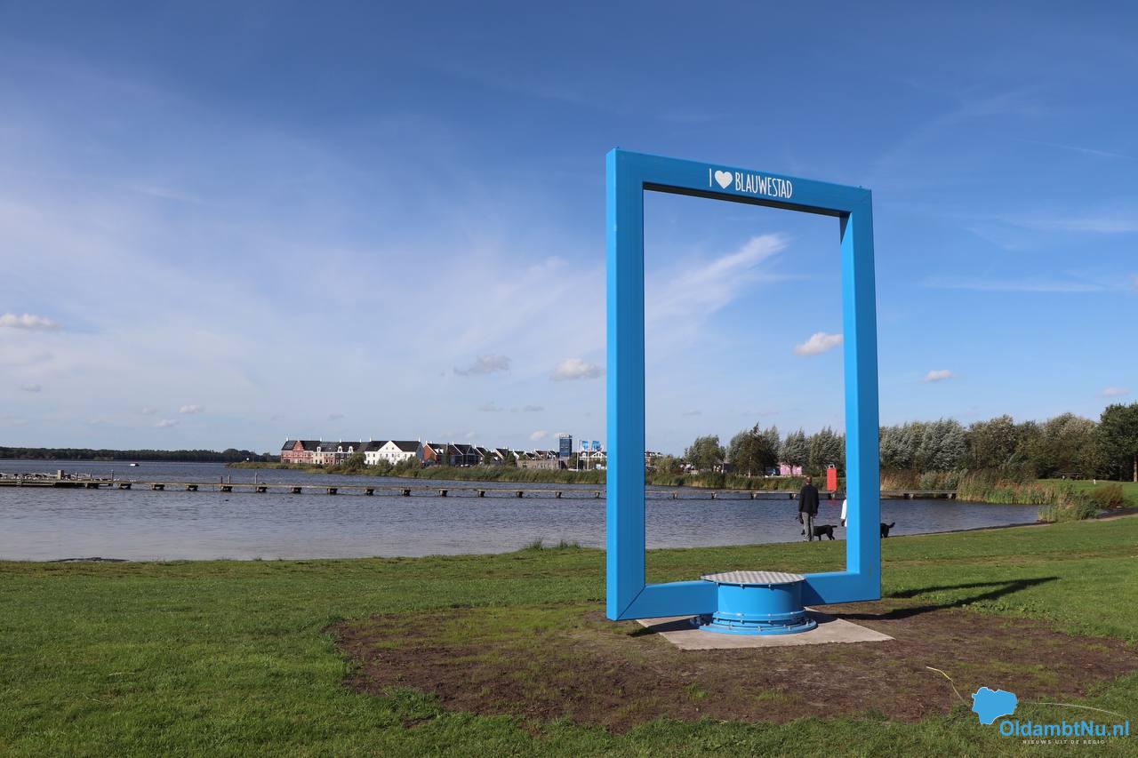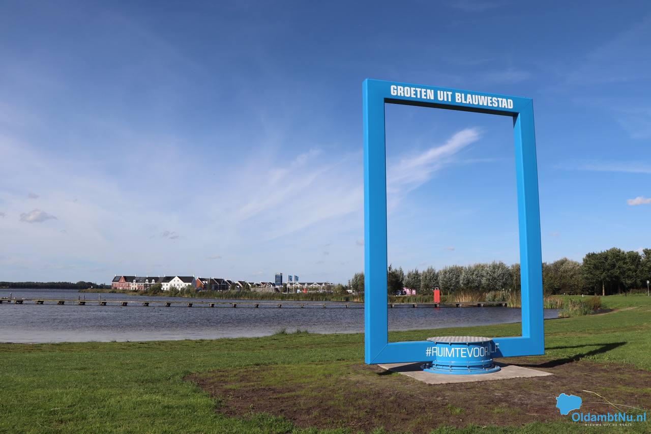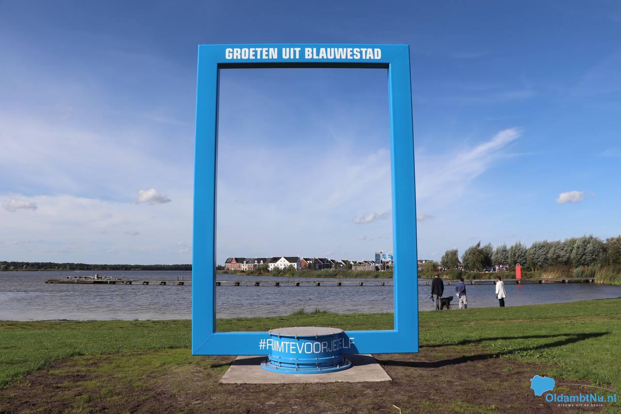 Blauwestad – Wie de afgelopen dagen in de buurt van de Wilgenborg was, heeft hem vast al gespot: een groot blauw venster bij het hondenstrandje langs de Elfenbank. Al voordat de letters van Blauwestad erop stonden, werden er al volop foto’s gemaakt en gedeeld op de sociale media.