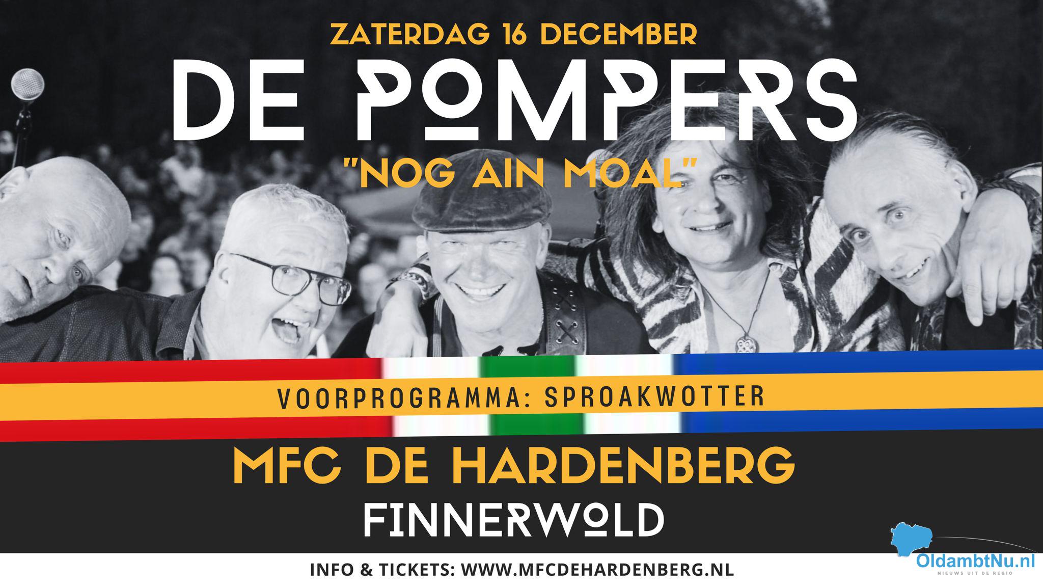 Sproakwotter en de Pompers blijkt een unieke combinatie te zijn voor onze regio. Reden te meer om Martin en Harry in het voorprogramma op te nemen. Het nieuwste nummer “Ons Hardenbaarg” zal vast in de setlist worden opgenomen. ‘De Pompers goan op hoes aan.’ Op zaterdagavond 16 december 2023 gaat de band weer ‘pompen’ te Finsterwolde. Op het programma staan oude en nieuwe nummers. ‘Ze pompen en pompen mor deur, want Pompers is hetzulfde as bier’.