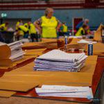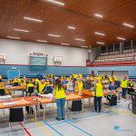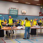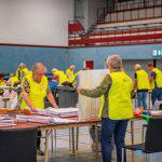 In een andere ruimte in de sporthal zit een team om alle cijfers en namen digitaal in te voeren. Van de ruim 80 mensen hier nu in de sporthal aanwezig, waren gisteren ook al een aantal aanwezig bij de ontvangst en controle van de stemkaarten en uitgifte van het stembiljet, maar ook ‘s avonds bij het tellen.