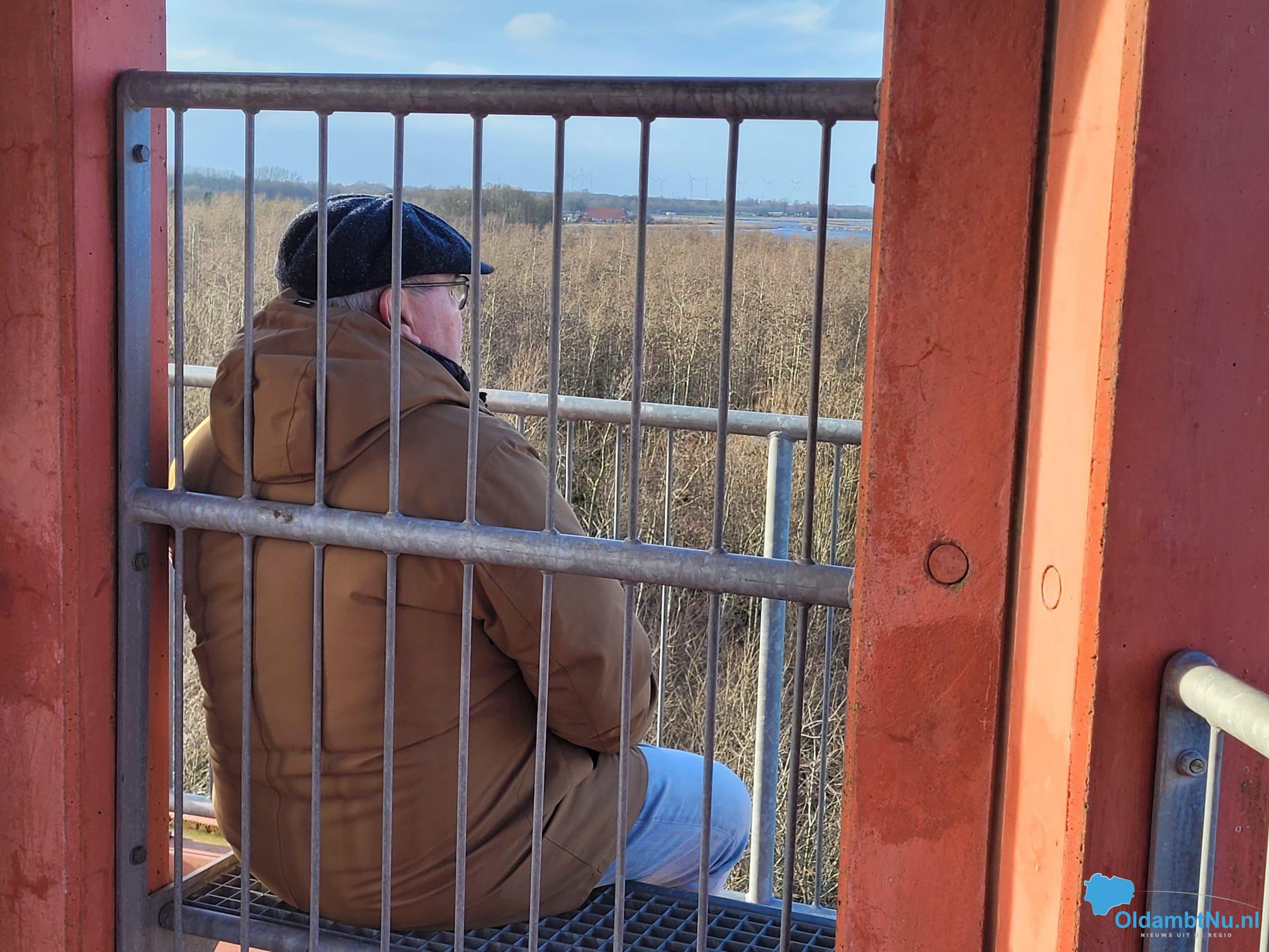 We hadden deze keer afgesproken bij de uitkijktoren in het natuurgebied Reiderwolde. Dat lag meer op zijn route had hij gezegd. En dat was ook de reden dat we dit jaar extra vroeg hadden afgesproken, want dan kon hij deze dag meer mensen ontmoeten dan voorheen: ‘De behoefte in een goed gesprek is hoog!’ was zijn ervaring.