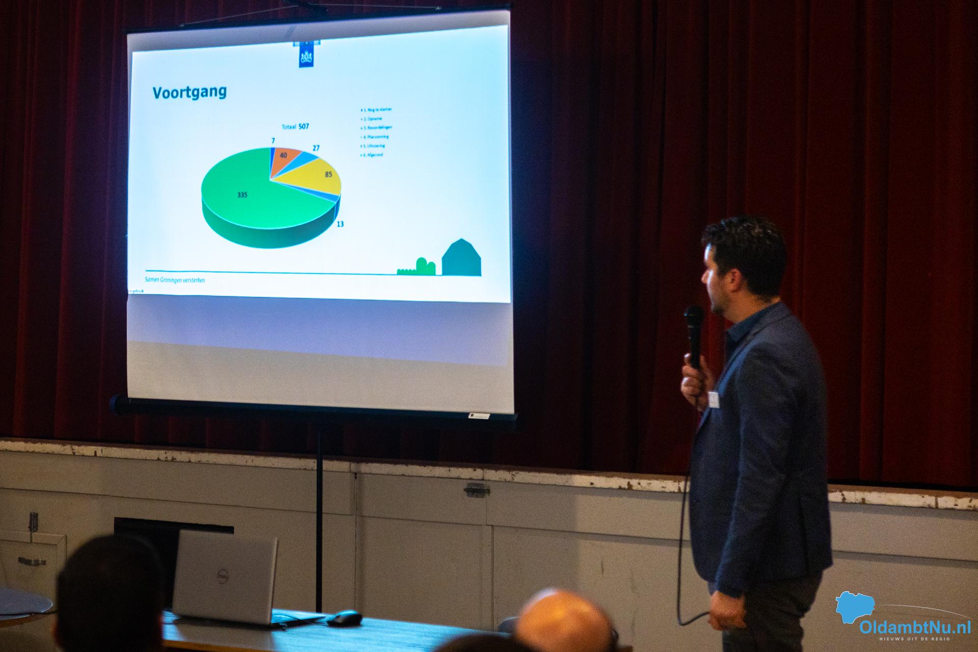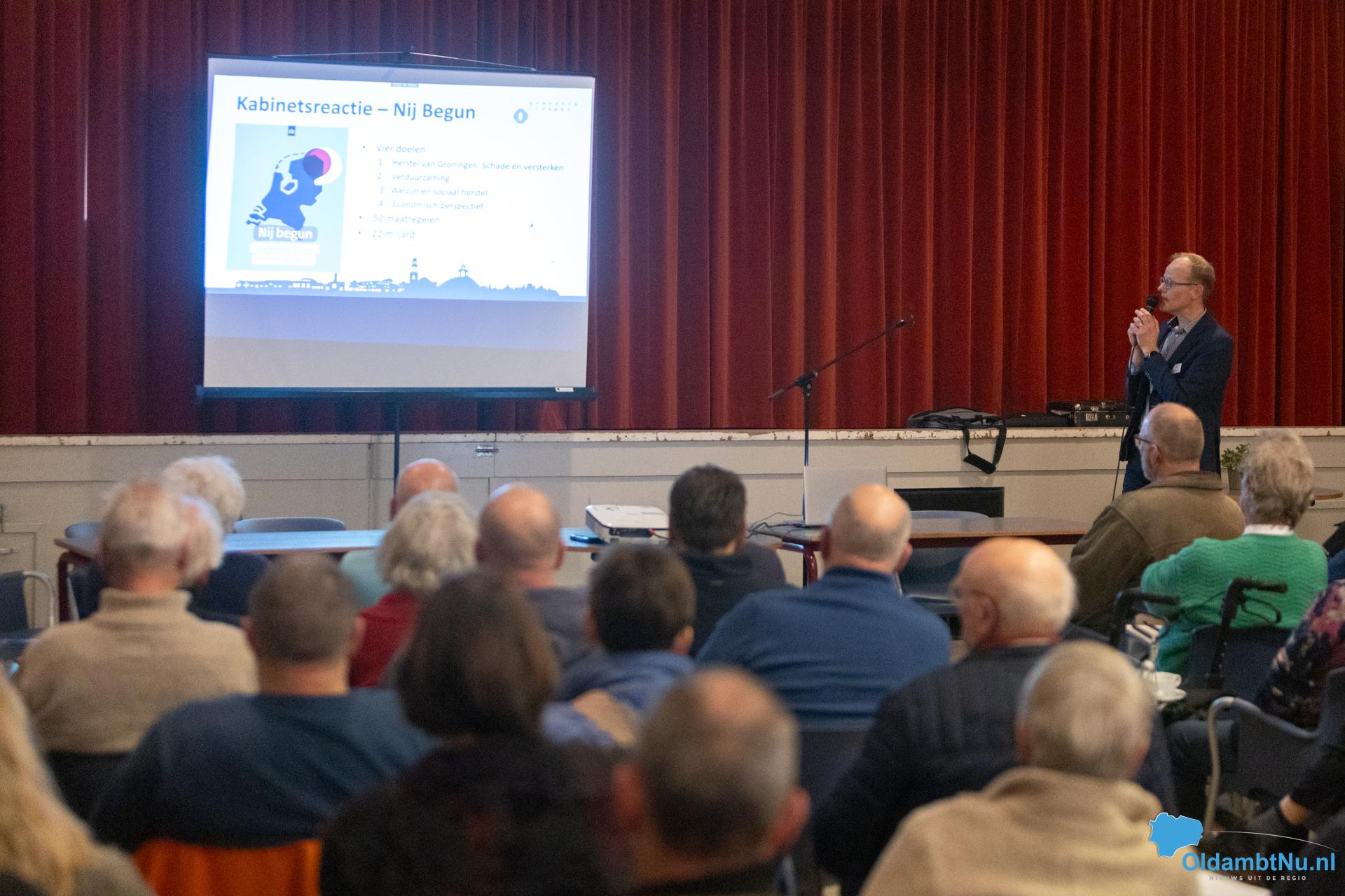 Ongeveer 135 mensen waren naar Nieuwolda gekomen. Allereerst opende burgemeester Cora Yfke Sikkema de avond. Ze moest wethouder Gert Engelkens verontschuldigen wegens ziekte, maar Erwin Vening* was een gedegen vervanger. Samen met Bob de Wildt** van NCG en Siebe Keulen*** van IMG werd eerst de huidige stand van zaken weergegeven. In het kader van de kabinetsreactie Nij Begun werden een aantal vooruitgangspunten benadrukt. “We horen vaak, er gebeurt niks, maar ondertussen zitten we allemaal echt niet stil.”