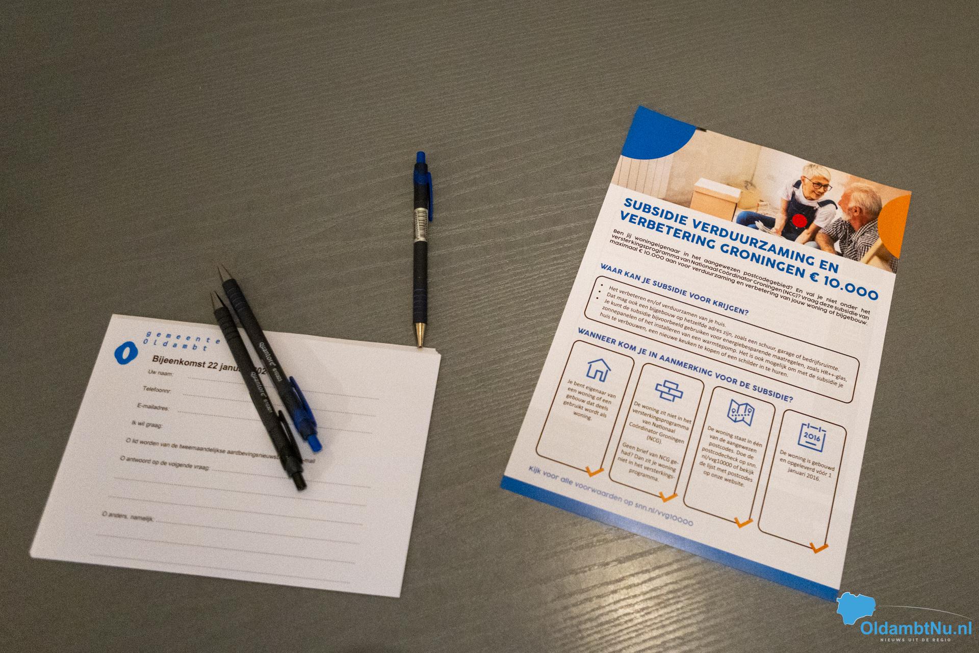 Ook Siebe Keulen was uitgesproken: “Ik ben hier vanavond met nog veel andere contactpersonen om vragen te beantwoorden. En mocht u van mensen weten die twijfels hebben over schades indienen of wat ook, wijs ze er op dat we ook via de steunpunten echt bereikbaar zijn.” Er waren brochures over het aanvragen van verduurzamingssubsidie, de onafhankelijke inwonersondersteuners en mensen konden een formulier invullen om de aardbevingsnieuwsbrief van de gemeente te ontvangen.