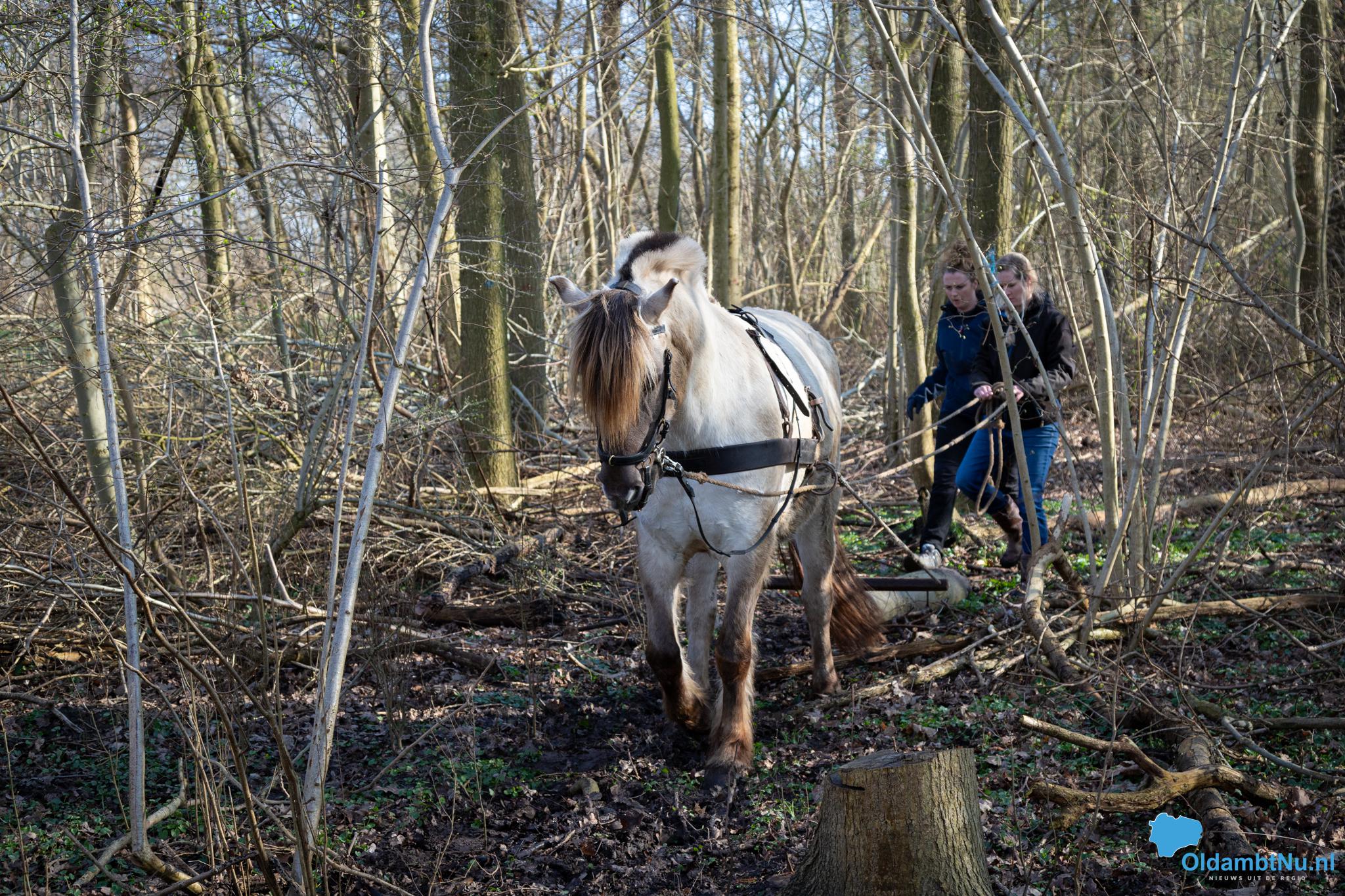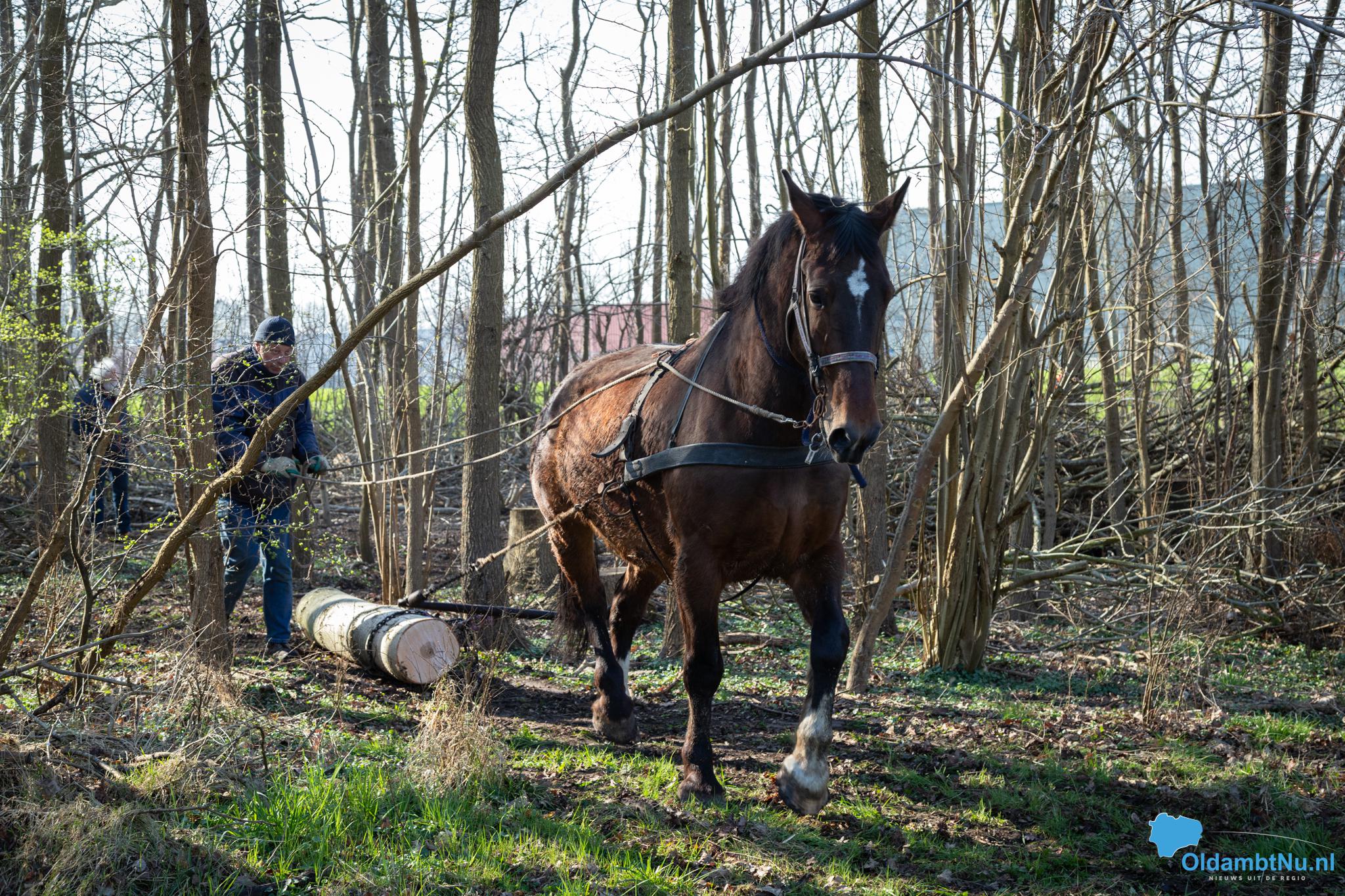 Omdat het slepen met bomen best een zware klus is, is er al vrij snel, met subsidie van de gemeente, een trekkertje aangeschaft. Deze dag werden de boomstammen echter uit het bos gehaald door trekpaarden. Het leek even “vroeger tijden”, maar hoe praktisch het is blijkt wel wanneer de paarden moeiteloos door de begroeiing lopen over de zompige ondergrond. Daar waar machines niet zouden kunnen komen zonder veel te vernielen.