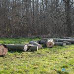 Trekpaarden slepen bomen uit bos Heiligerlee