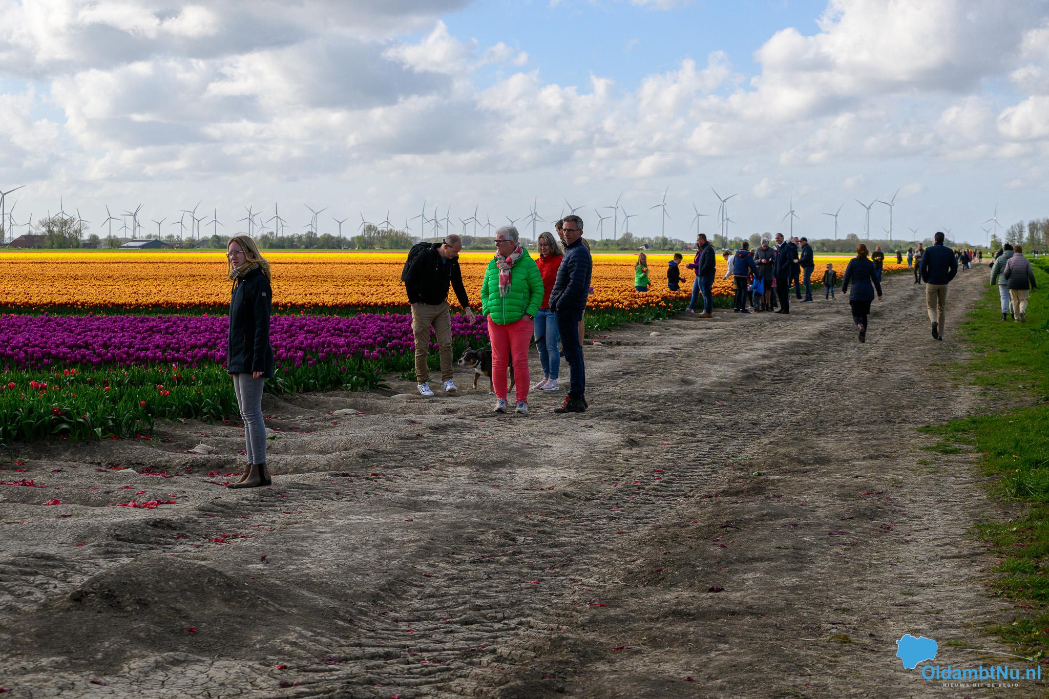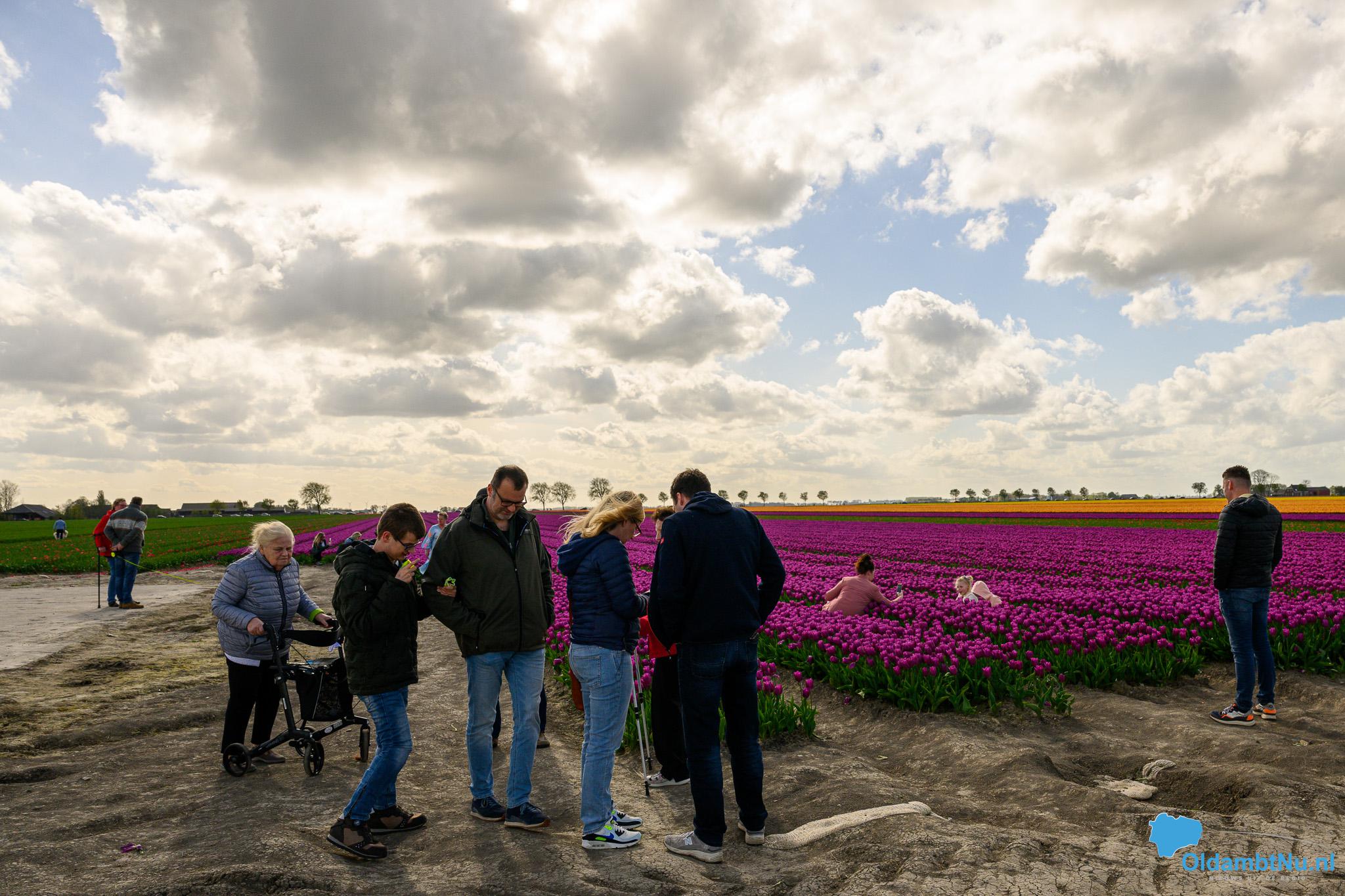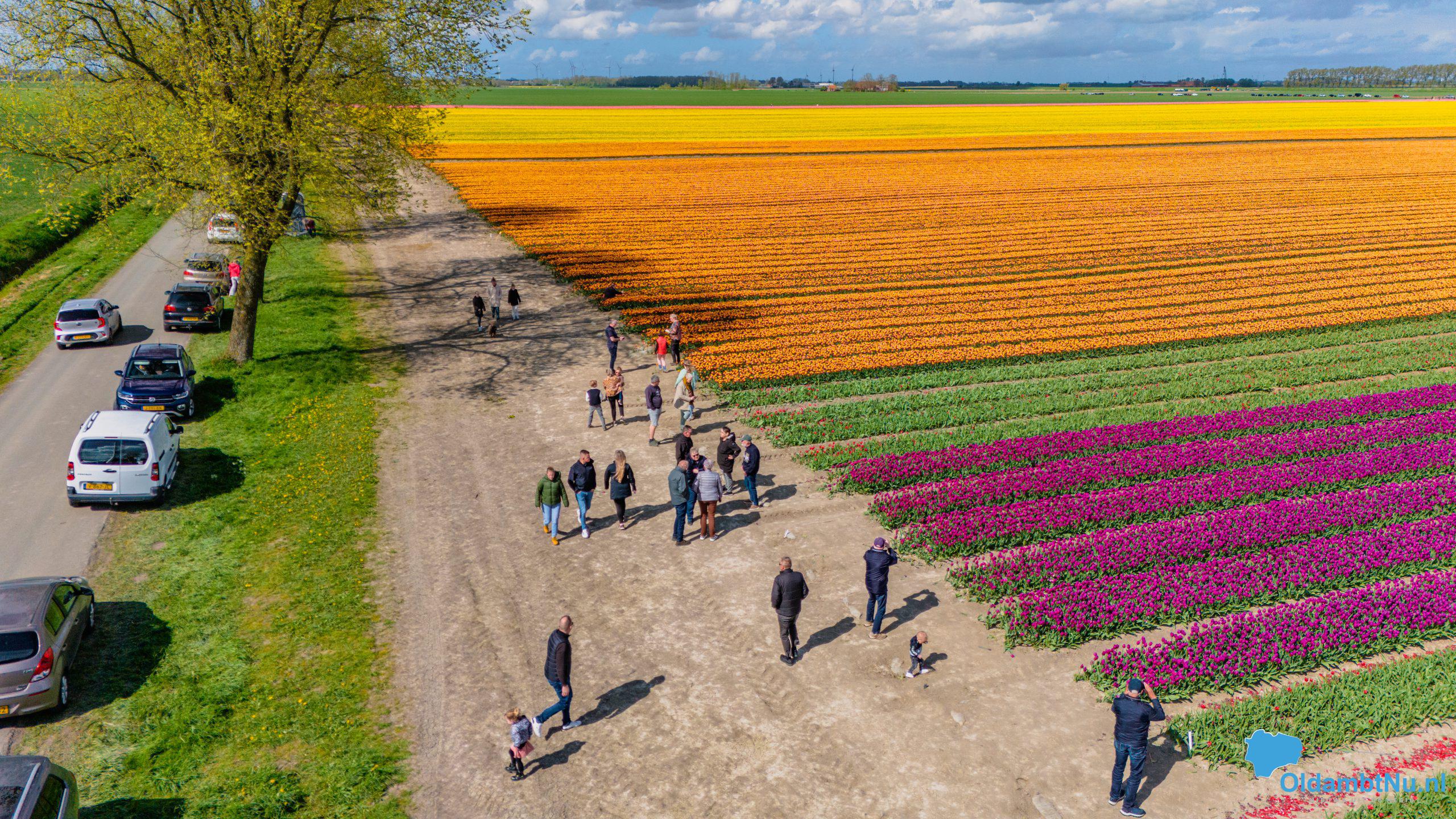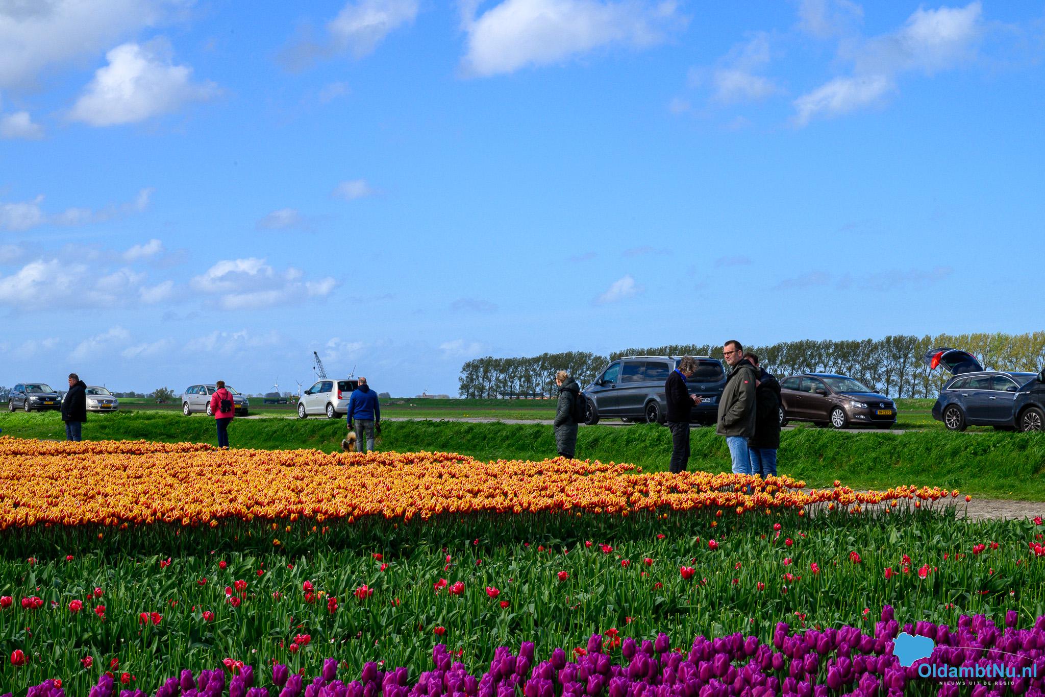 Reiderwolderpolder – In de uitgestrekte Reiderwolderpolder is een kleurenexplosie gaande. De bloeiende tulpenvelden zijn momenteel het decor van een prachtig schouwspel dat honderden, misschien wel duizenden bezoekers trekt, zo ook op deze stralende zondag. De verleidelijke aanblik van de kleurrijke bloemen heeft een ware verkeerschaos veroorzaakt, met files en veel geparkeerde auto’s.
