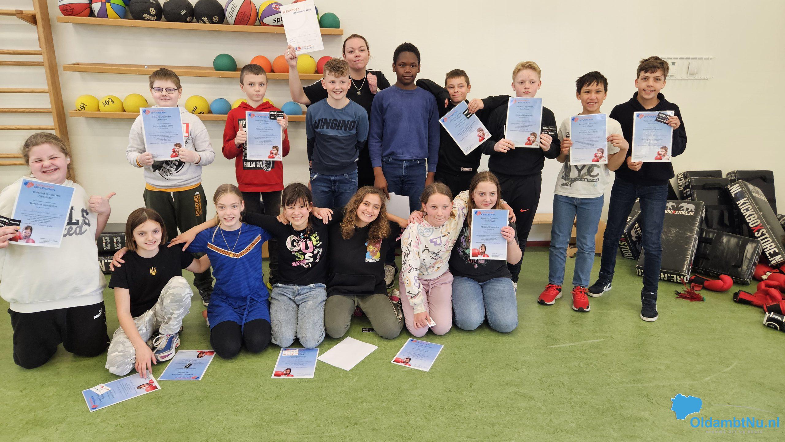 Winschoten – Op Kindcentrum Houwingaham in Bad Nieuweschans heeft Wilma Hassinck, gediplomeerd sportinstructeur, een serie van 8 lessen ‘Boksend opvoeden’ in de gemeente Oldambt afgerond. Wethouder Erich Wünker heeft deze vrijdag een kijkje genomen, hoe deze laatste lessen voor de groepen 3 tot en met 8 op deze basisschool verlopen.