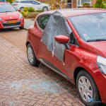 Bij sommige auto’s is één raam aan diggelen, maar bij andere zijn er wel vier ruiten uit. De schade is niet alleen bij auto’s die langs de weg stonden geparkeerd, maar ook bij auto’s die op een oprit stonden.