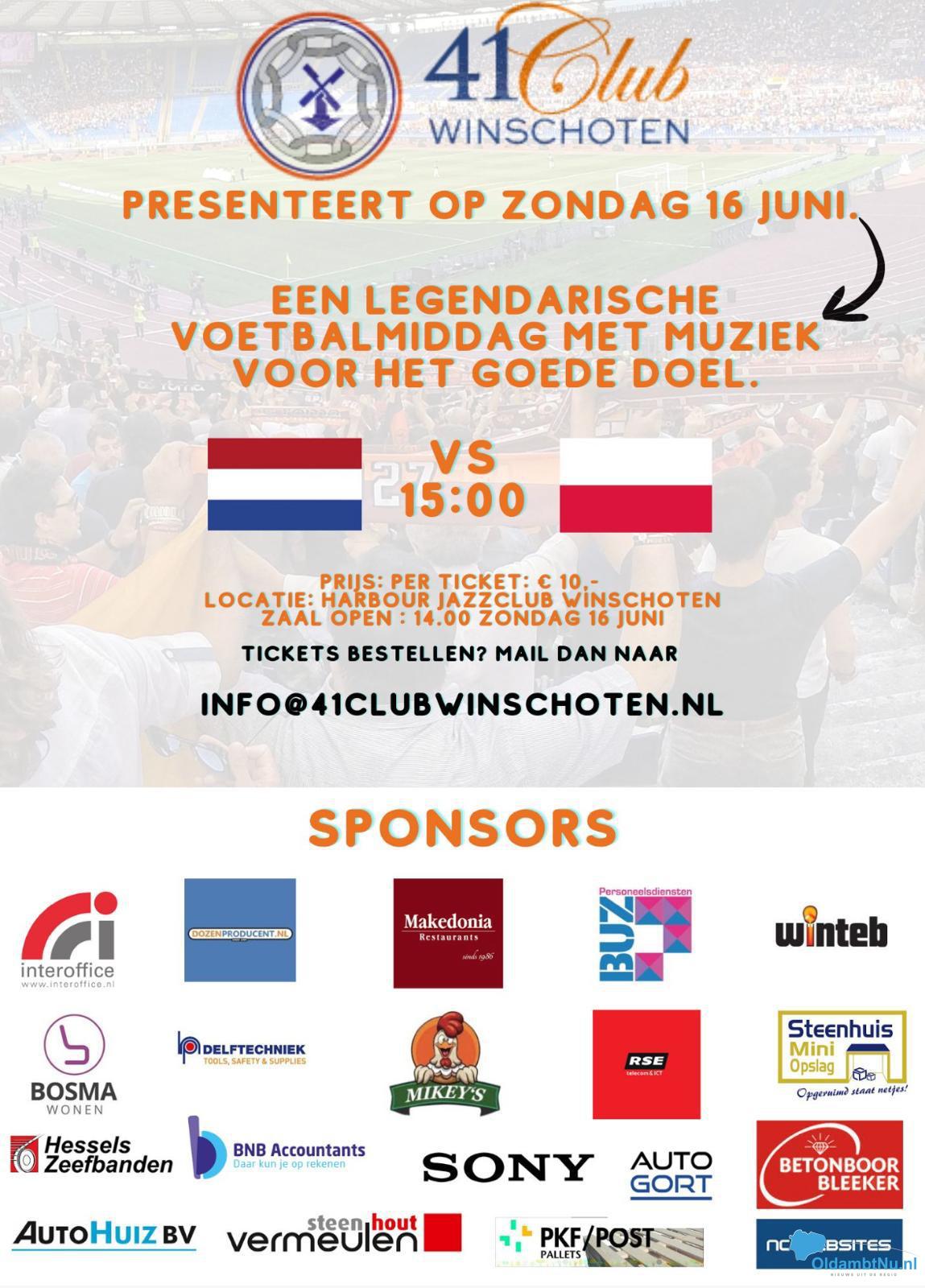 De EK-wedstrijd Nederland – Polen start om 15.00 uur op grote schermen. De zaal is vanaf 14.00 uur geopend. Dit zal een legendarische voetbalmiddag met muziek worden waarvan de opbrengsten naar het goede doel gaan.