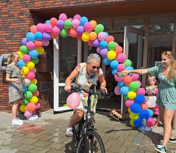 Aan het eind van de ochtend heeft de school op gepaste wijze afscheid genomen van groep 8. En niet alleen van groep 8. Juf Truus ging samen met groep 8 door een erehaag van alle kinderen, al fietsend, voor de allerlaatste keer de school uit.