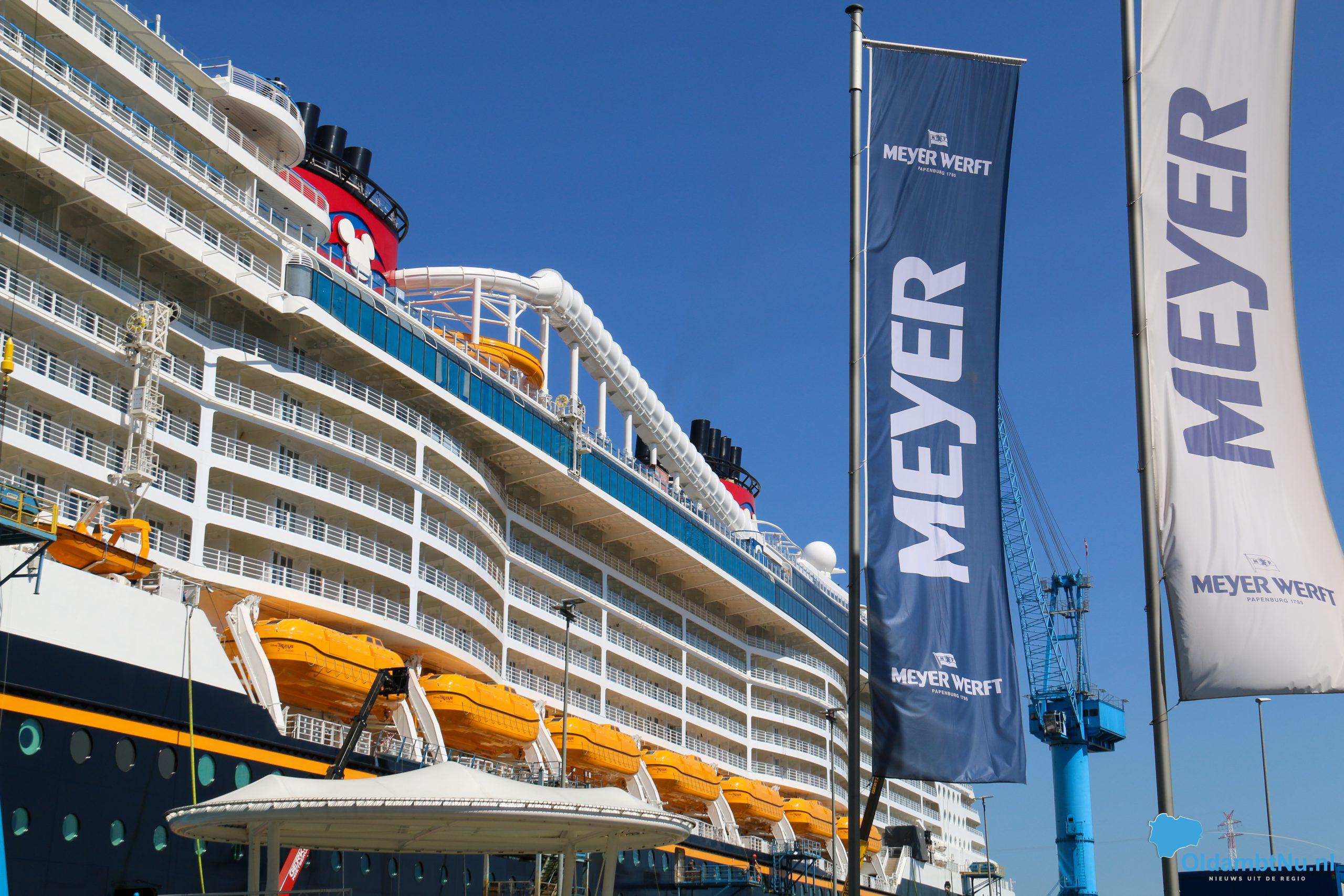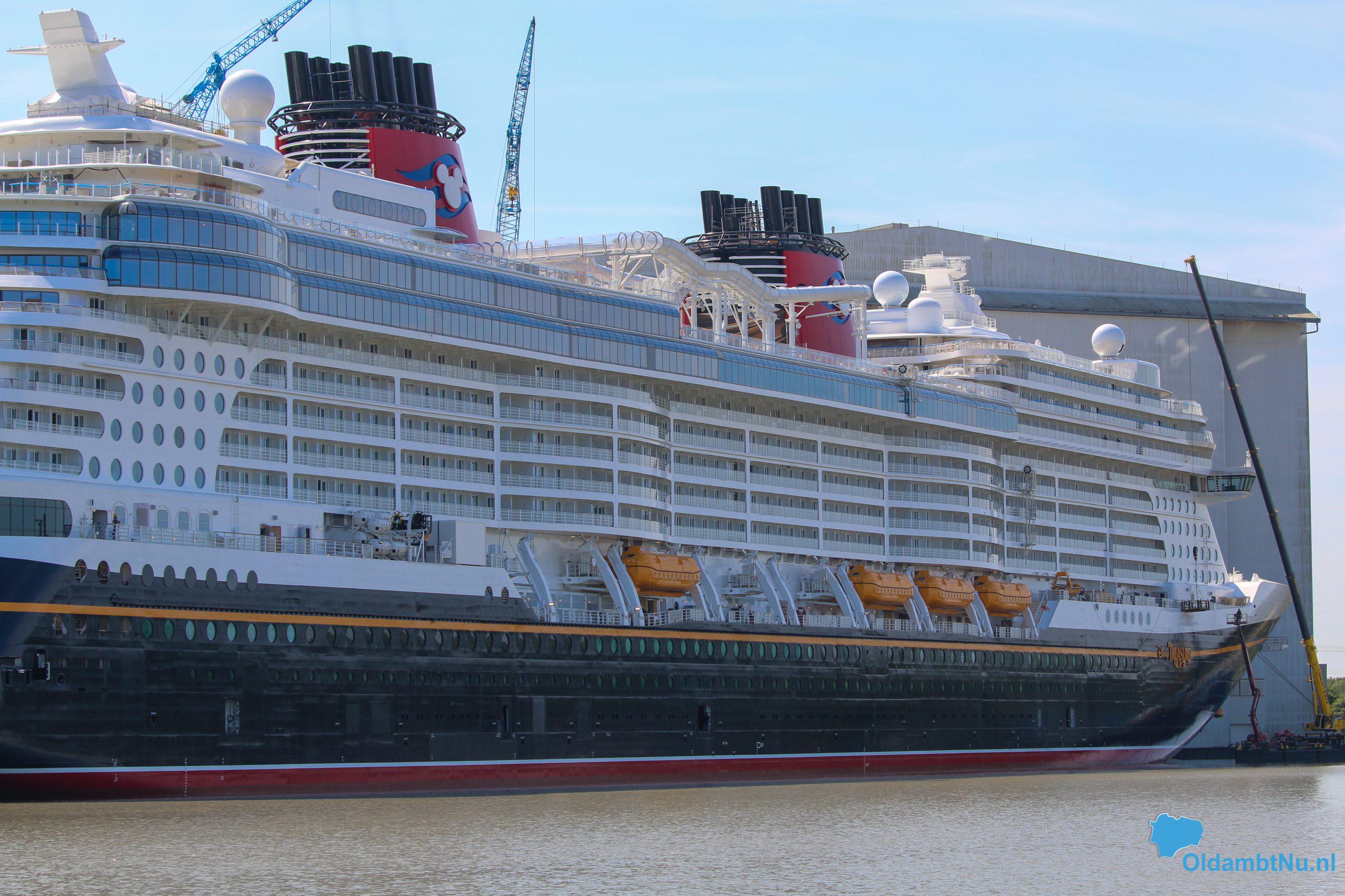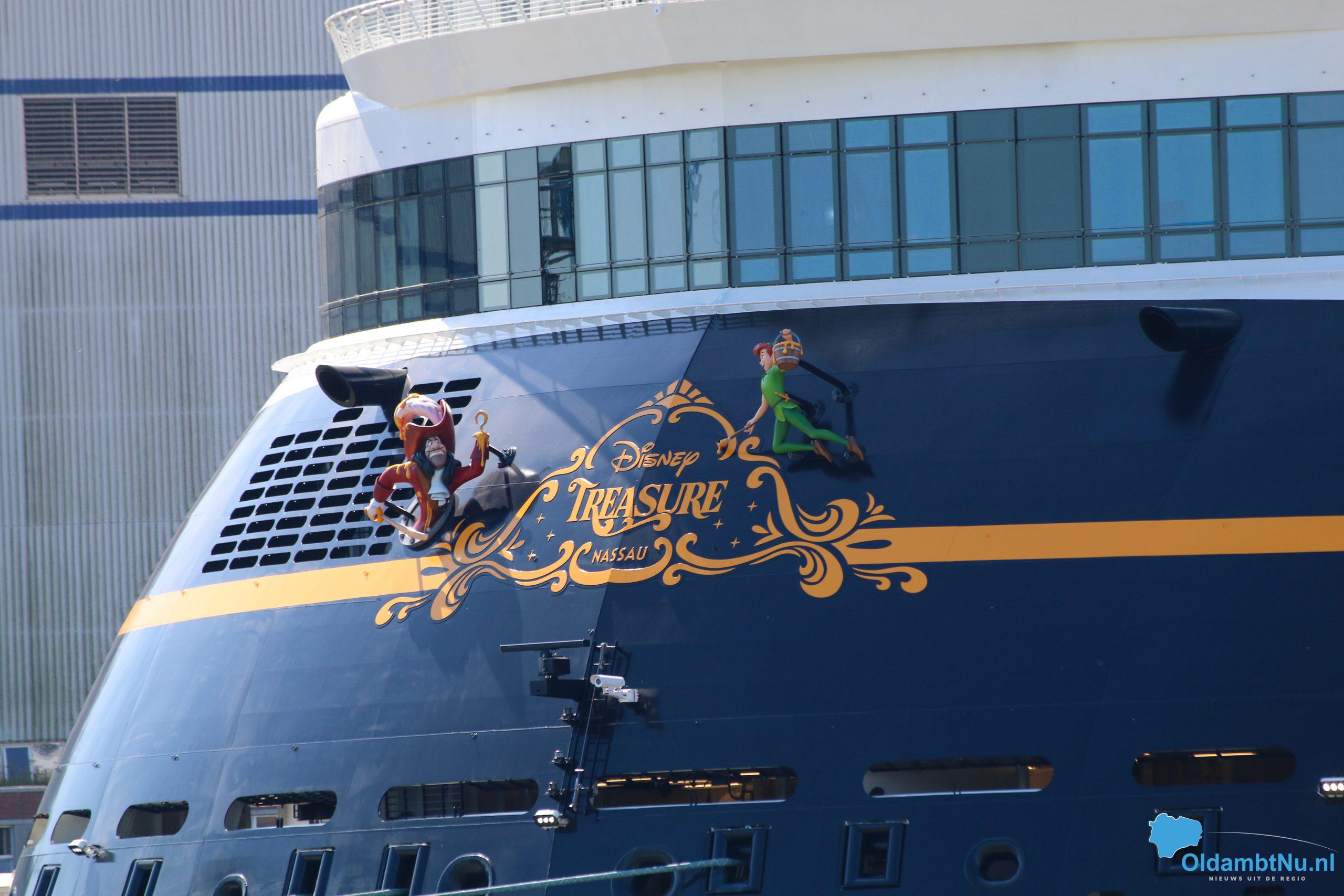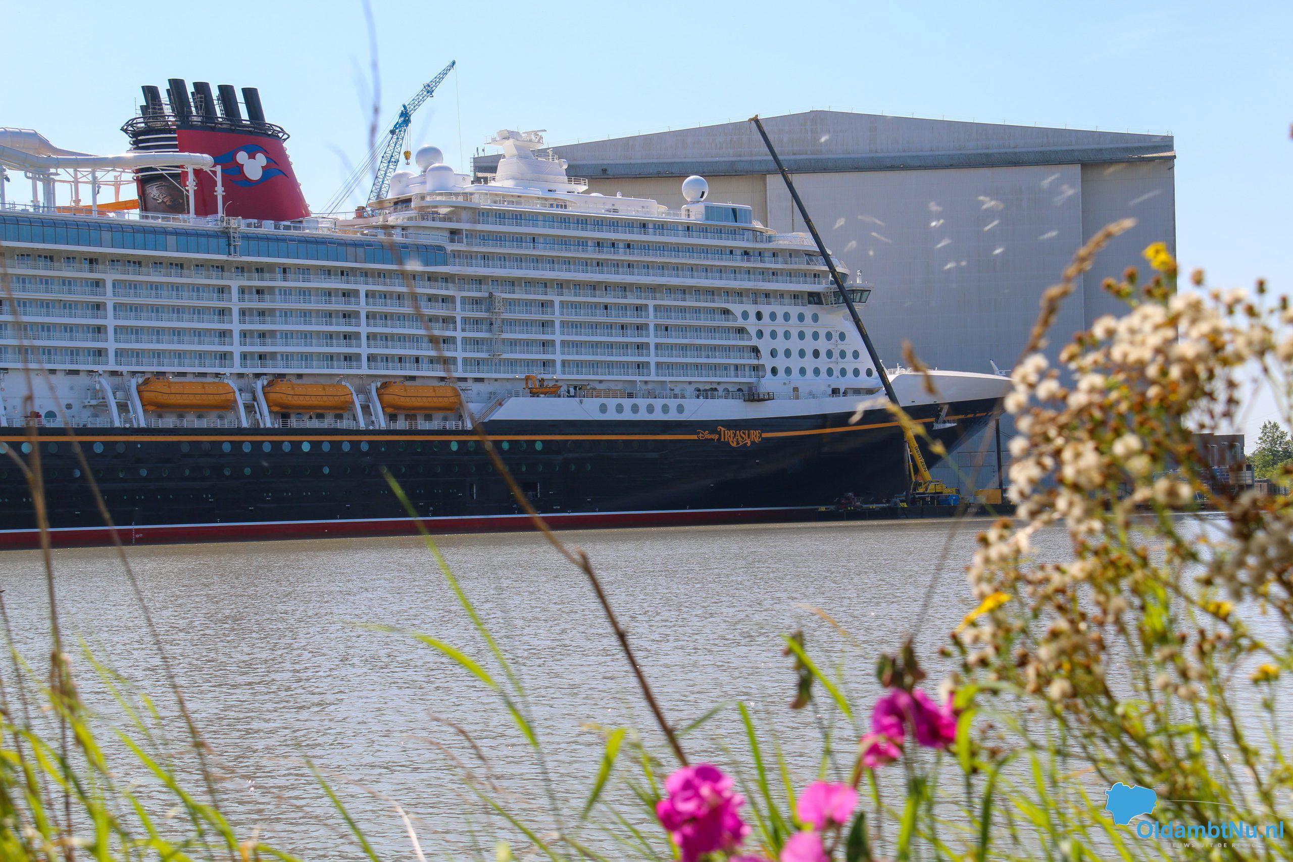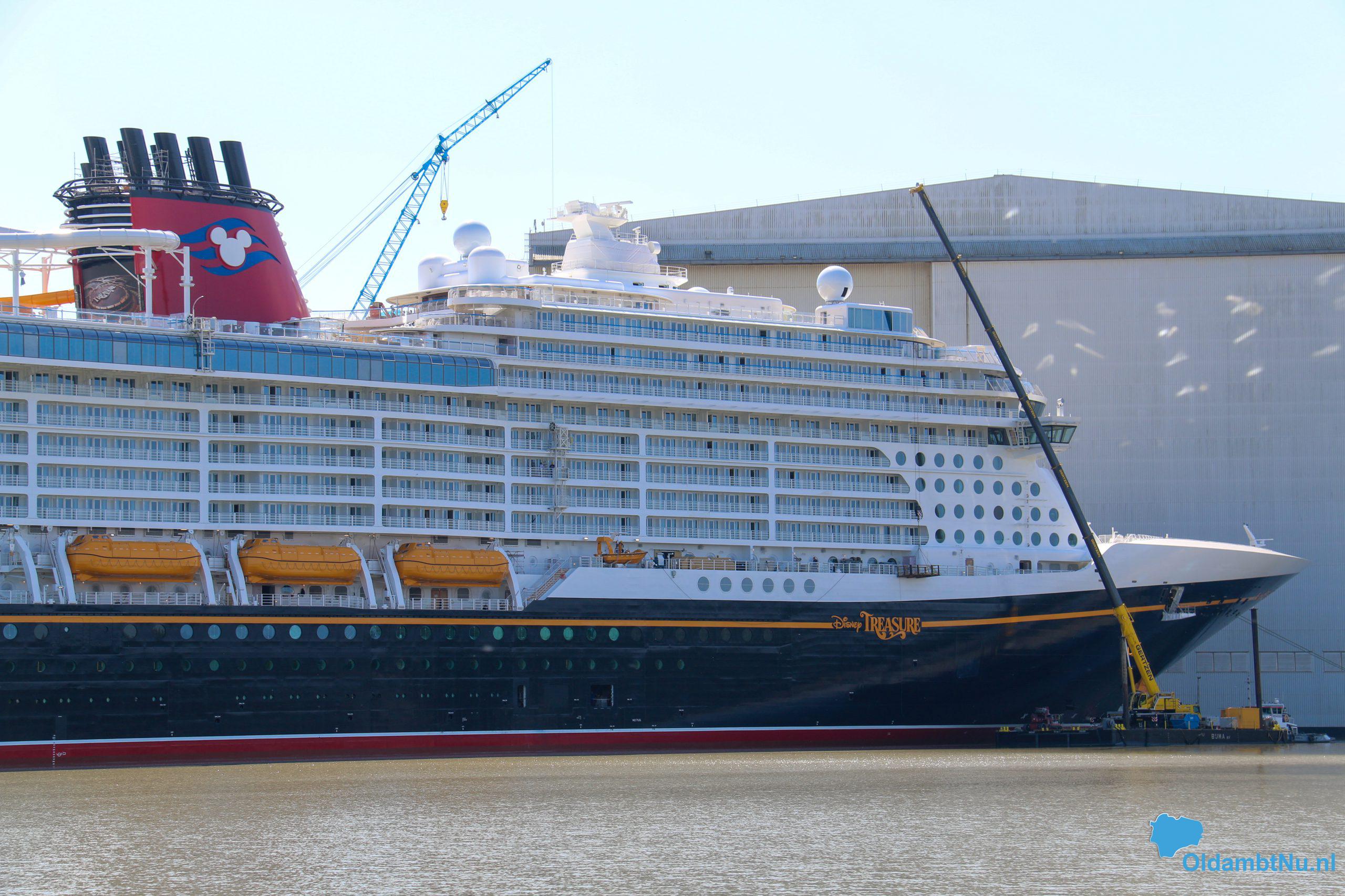 Papenburg – Afgelopen weekend is het nieuwe cruiseschip voor Disney Cruise Line, de Disney Treasure, uitgedokt op de scheepswerf Meyer Werft in Papenburg. Het nieuwe schip kwam met vuurwerk de enorme bouwloods uit waar Mickey het nieuwe schip stond op te wachten. Op het achtersteven van het schip zijn Kapitein Haak en Peter Pan te zien.