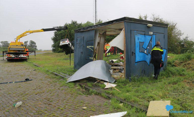 Bad Nieuweschans – Vrijdagmorgen rond 08.00 uur is een auto vanaf de A7 over de controleplaats van de Marechaussee door een keet heen gereden. Het voertuig is tot stilstand gekomen in een sloot.