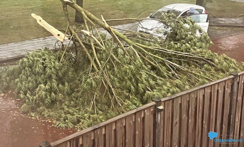 Aan de Piet Heinlaan in Winschoten is een grote tak van een boom door de storm afgebroken. De gemeente Oldambt zal de boom verwijderen. Tot die tijd is de straat niet met de auto begaanbaar.